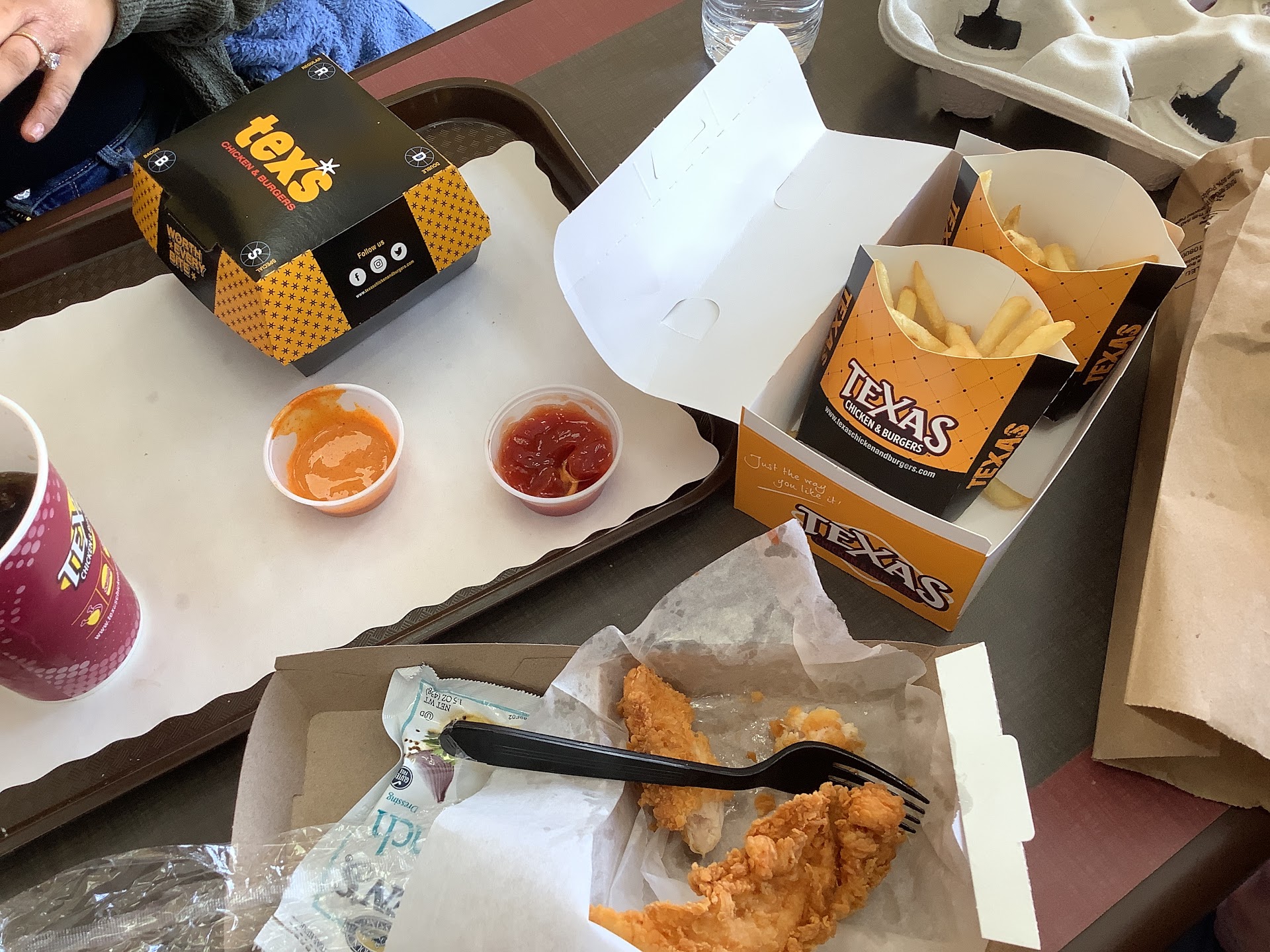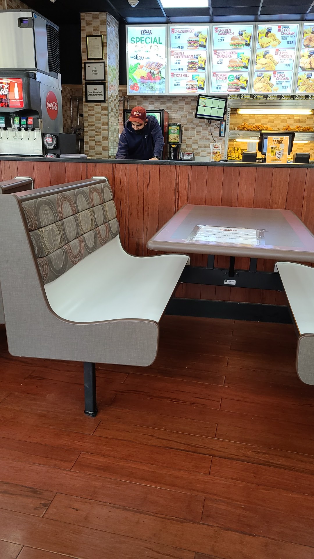Read moreI heard Texas Chicken at this location was bad, but I tried it anyway for break at work. Upon entry, the upkeep at the counter and soda fountain needed improvement. Covers were on the floor, soda that had been spilled left a sticky residue around the fountain, and various trash from previous diners on the floor. It wasn't "God awful", but noticeable. The food was warm, just made. Ordered chicken tender meal, regular. When I got back to work, discovered the tenders were bland and slightly greasy. One of them was slightly undercooked. It seemed the batter had no flavor added (salt or pepper). I tasted the oil it was fried in, it didn't taste like old oil though. The fries were okay, not soggy, not crispy, not salty. I don't like salty fries, but I know I'm not the average frie consumer. The biscuit was partly soft, but the outer part was slightly hard, dryish. Patrons managed their own social distancing.