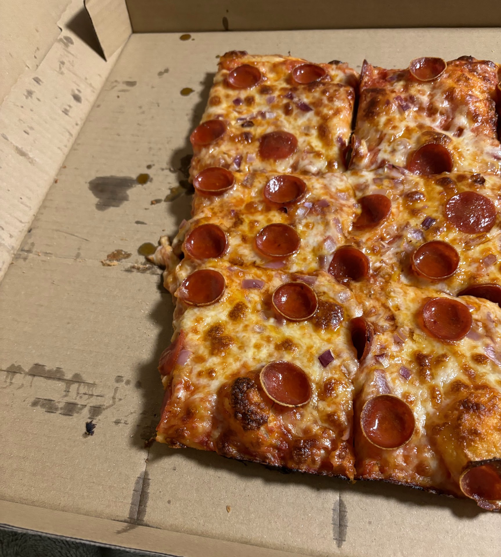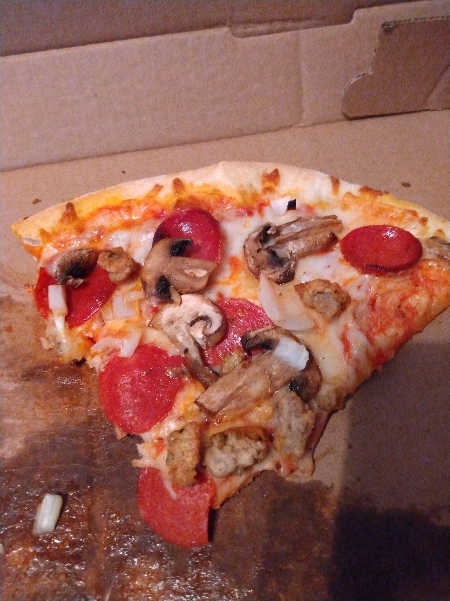 Also, they couldn’t be bothered using waxed paper in the box. Didn’t notice the cardboard-y taste on my slices, but it is bad (and cheap) way to serve your customers.