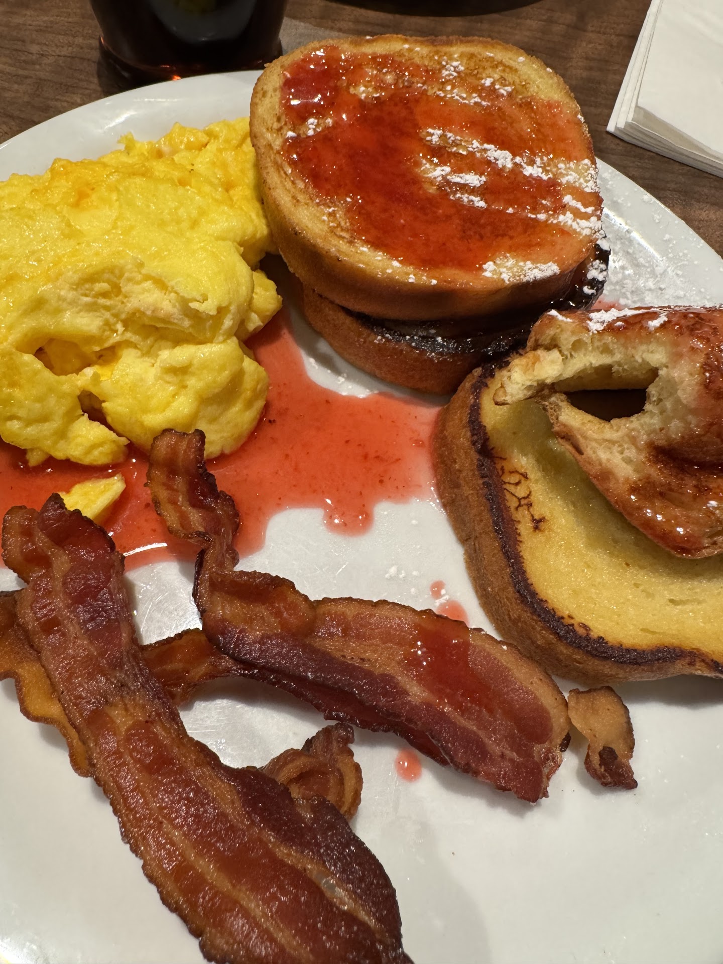 So then I am thinking that the food should make up for it. I was disappointed. First, I ordered the cinnamon roll pancakes with eggs, hash browns, and told them I wanted both bacon and sausage. The sausage was cold and the bacon was the wimpiest and saddest looking bacon I have ever seen. Come on...for what customers pay, the bacon and sausage should be beyond awesome, but not a chance. Just awful.