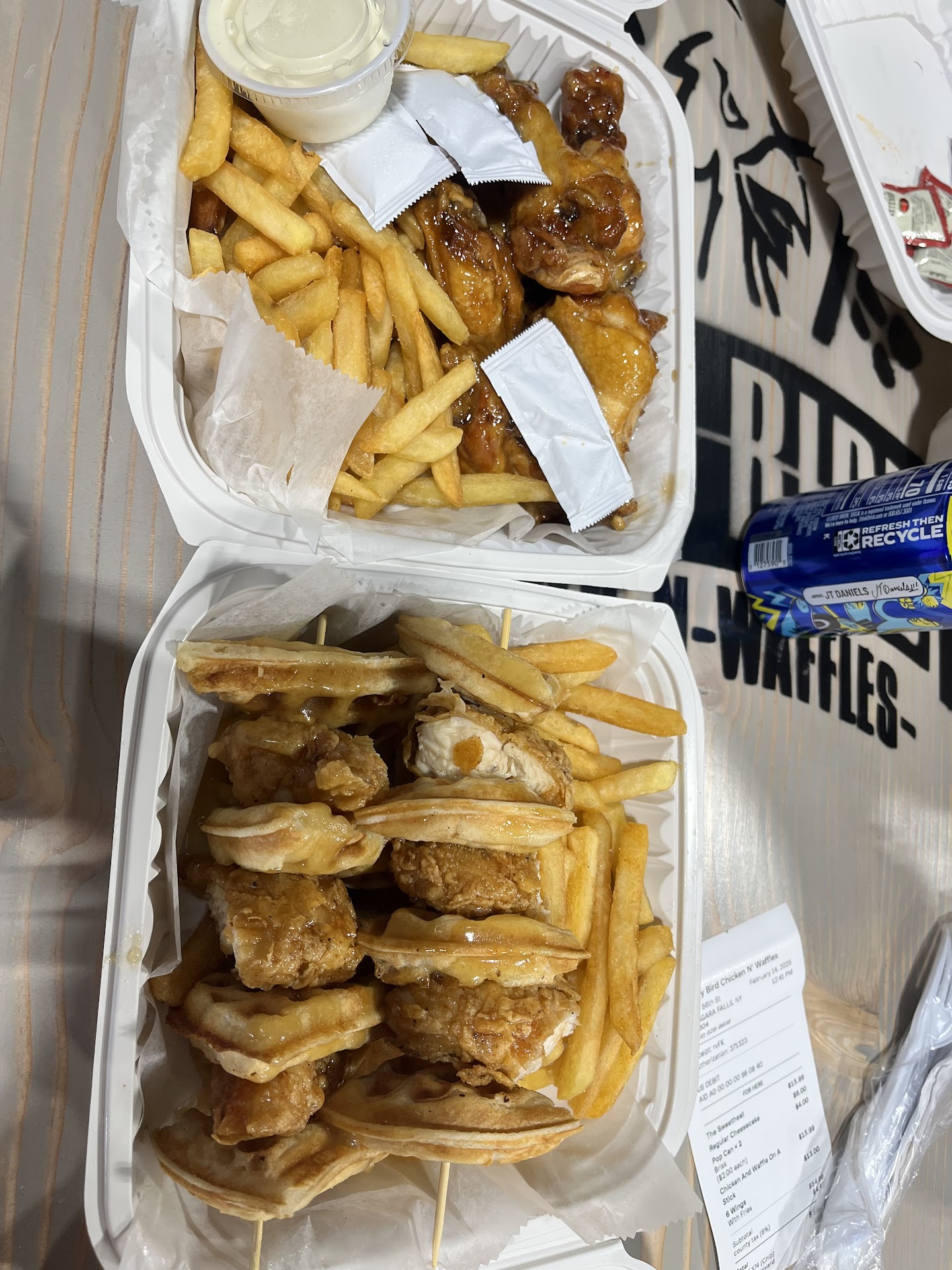 With all that being said. I got a regular chicken waffle meal, and a bird box sampler delivered by doordash.