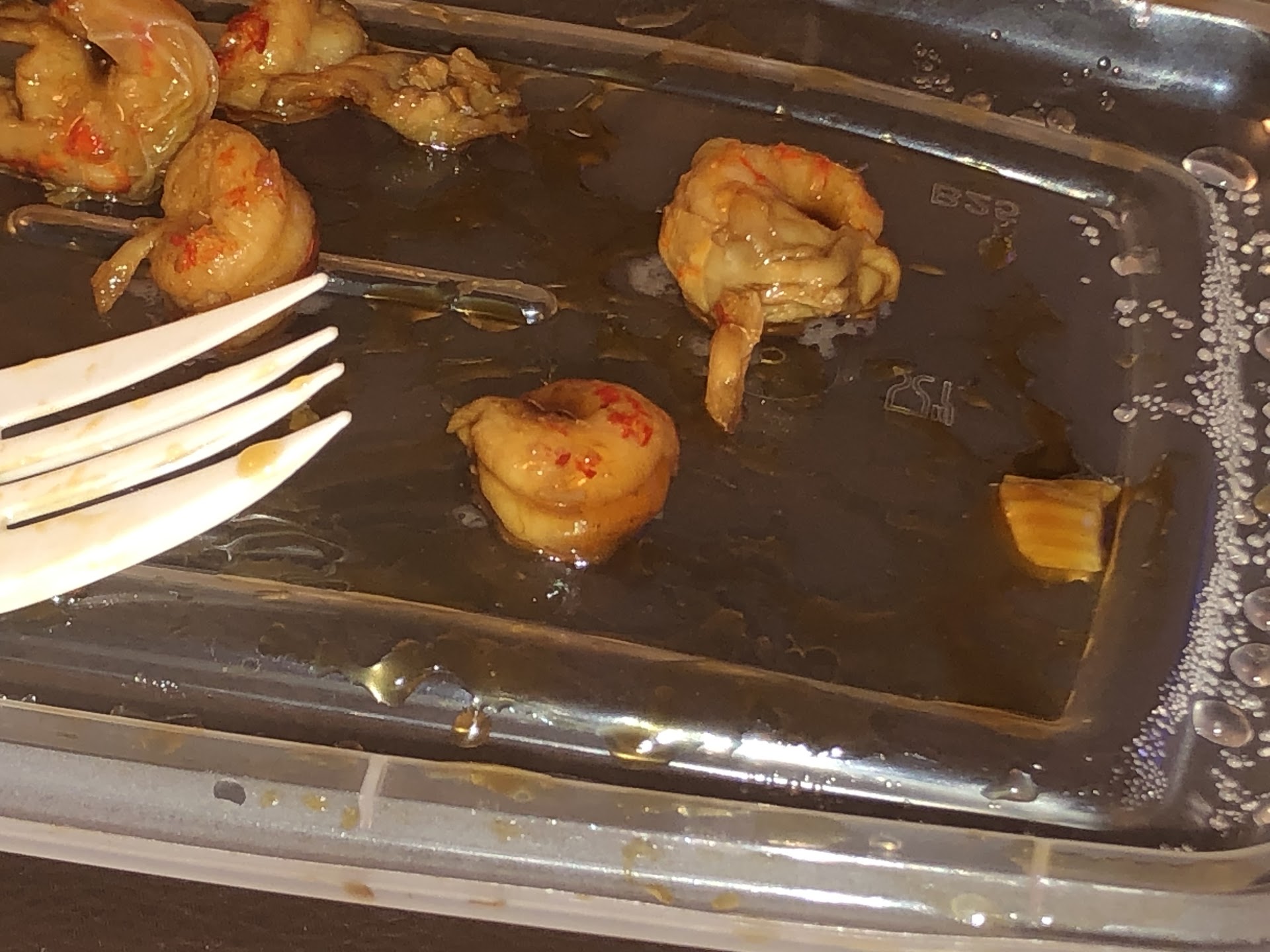 I can't even begin to describe the texture. They must pound it for quick cooking, but this was practically gelatinous and fell apart. The veggies were in a half inch of condensation/water and were soggy. The chicken in the Hunan chicken was like the steamed, but were also gristly, fatty pieces. The brown sauce was very oily and had a bitter taste. The General Tso's sauce we got on the side was okay. We ate the ribs, some rice, and some of the veggies, but the awful chicken was unceremoniously put down the disposer.