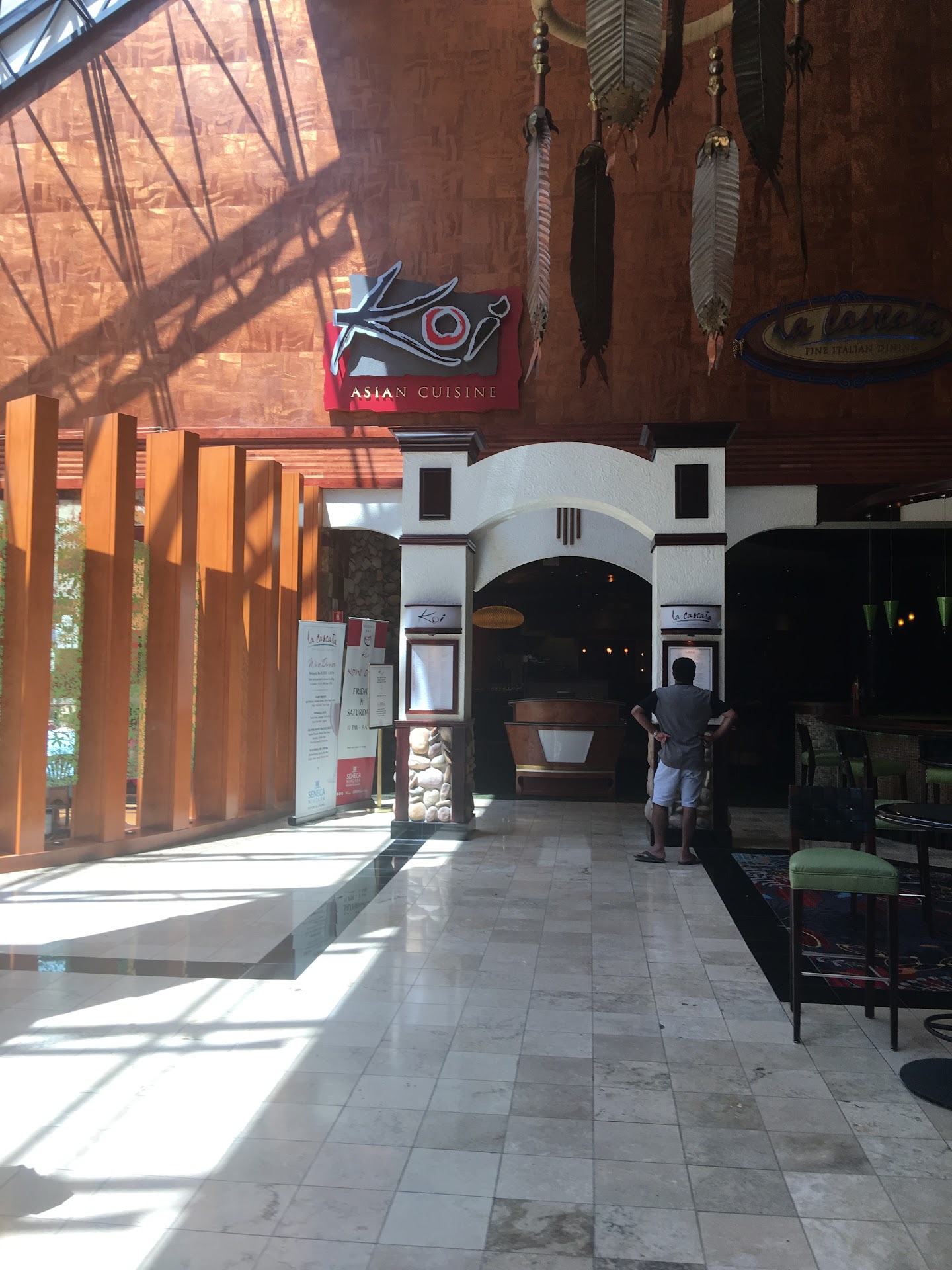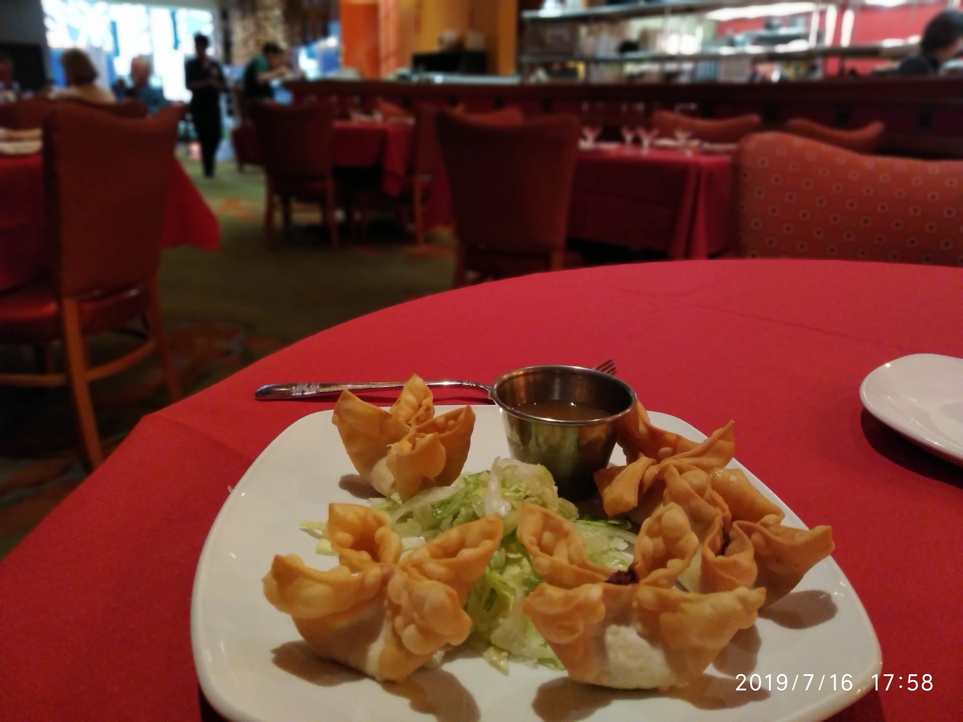 (A very generous 4 stars - read on) I joined a friend here for Asian food and they were very gracious in seating us early, as we arrived thirty minutes sooner than our reservation. Having lived in various points in the Pacific Rim, I must say they have a very creative take on fusion and many delights. The ambience was wonderful - curved tall sweeping walls of river rock punctuated with some very nice minimal design touches. While I generally really dislike banquettes, theirs was so vast and afforded so much room between tables that it was quite comfortable - and beautiful. We started with shrimp wonton soup. The broth was the nectar of the gods - as good as any homemade broth and the wontons were fresh made and thin, enveloping an almost too large whole shrimp.. Delicious despite the baby bok choy being inedible. Also as a starter, we ordered the spring rolls whose outer layers were microscopically thin and just perfectly crisp. We ordered four entrees and dined family style. The Vietnamese Shaking Beef dish was an epiphany. Im not a huge fan of filet mignon but they diced it smaller as one would for a beef stew and somehow managed to sear all six sides of each cube! This was accompanied by a masterful almost impossibly small brunoise of vegetable and other flavors that just sang. I would go there for that alone (OK and maybe the soup) We also had the Scallops and Mushrooms. The sauce ingredients listed included fish sauce and sounded wonderful but the hand in that department was tragically heavy, taking away all the sweetness (and lack of fishiness) that I love best about scallops. Our meal was rounded out by a respectable Buddha Delight vegetable medley and chicken fried rice. (and almost not worth mentioning but curious, the fortune cookies were stale and extra stupid) So why the grudging 4 stars?? After the main courses arrived, I found 2 of them to be just a tad underseasoned for my taste and neither of us could get our waitress or anyone else's attention for so long that the food was cooling off quite a bit. FINALLY I saw a gentleman (Maitre d'?) and flailed my arms because I wasn't going to let one more staff enter and never even bother to scan the room. He asked almost incredulously if I meant him and I said ANYBODY - I really need some soy sauce and a salt shaker. He acknowledged and a few minutes later don't I see him tell a different staff member I need this.....and then i wait and a few more minutes after that, they go and tell my actual server I need these!! So this clown made me go through three rungs of the chain of command for something that would have taken him thirty seconds! This is very piss-offing in a place that cost $240...