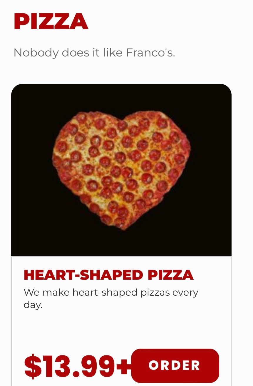 Ā Ā Ā Read morePoor service and management skills. I called Francos today superbowl Sunday at 1 pm and asked if they were making heart shaped pizzas. They said yes. So I ordered a heart shaped pizza with pepperoni for my boyfriend's birthday. Then ordered a second medium pizza party pack for my son and I. They asked when I wanted it delivered. I responded with as soon as possible. So when we received our pizza and opened the boxes I was very upset when they were both square. I called francos told them the issue and they transfered me to a manager. The manager said o sorry we are not making heart shaped pizzas today because of the super bowl. Well the thing is I would have not ordered two pizzas because it was supposed to be special for my boyfriend. Heart shaped! The superbowl wasn't for another 5 hours, the guy on the phone said they were making them, and the website says we make heart shaped pizzas everyday. The management did nothing to make this right. Im very unhappy with my experience with this francos and will not be ordering...