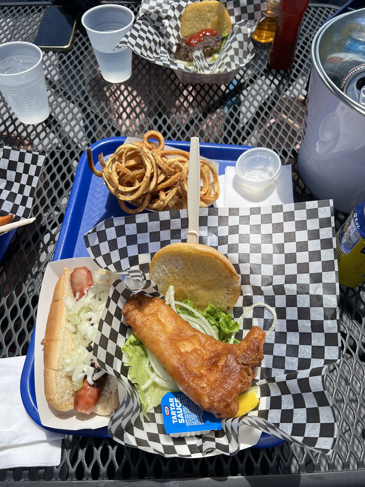 The food is standard "hot dog stand" meets small kitchen- you can get extras like shaved steak sandwich, crunch rolls, fish fry, fried pickles, etc but also the standard staples. As previously mentioned, majority of the food is grilled or fried so be prepared to select from those two categories. A really nice touch over most places with these menus is the wine / beer / canned malt beverages- you can't beat a hot dog or burger on the water with a cold drink. The food is very reasonably priced, the drinks are just slightly more than your neighborhood bar but less than a full fledged restaurant would be...