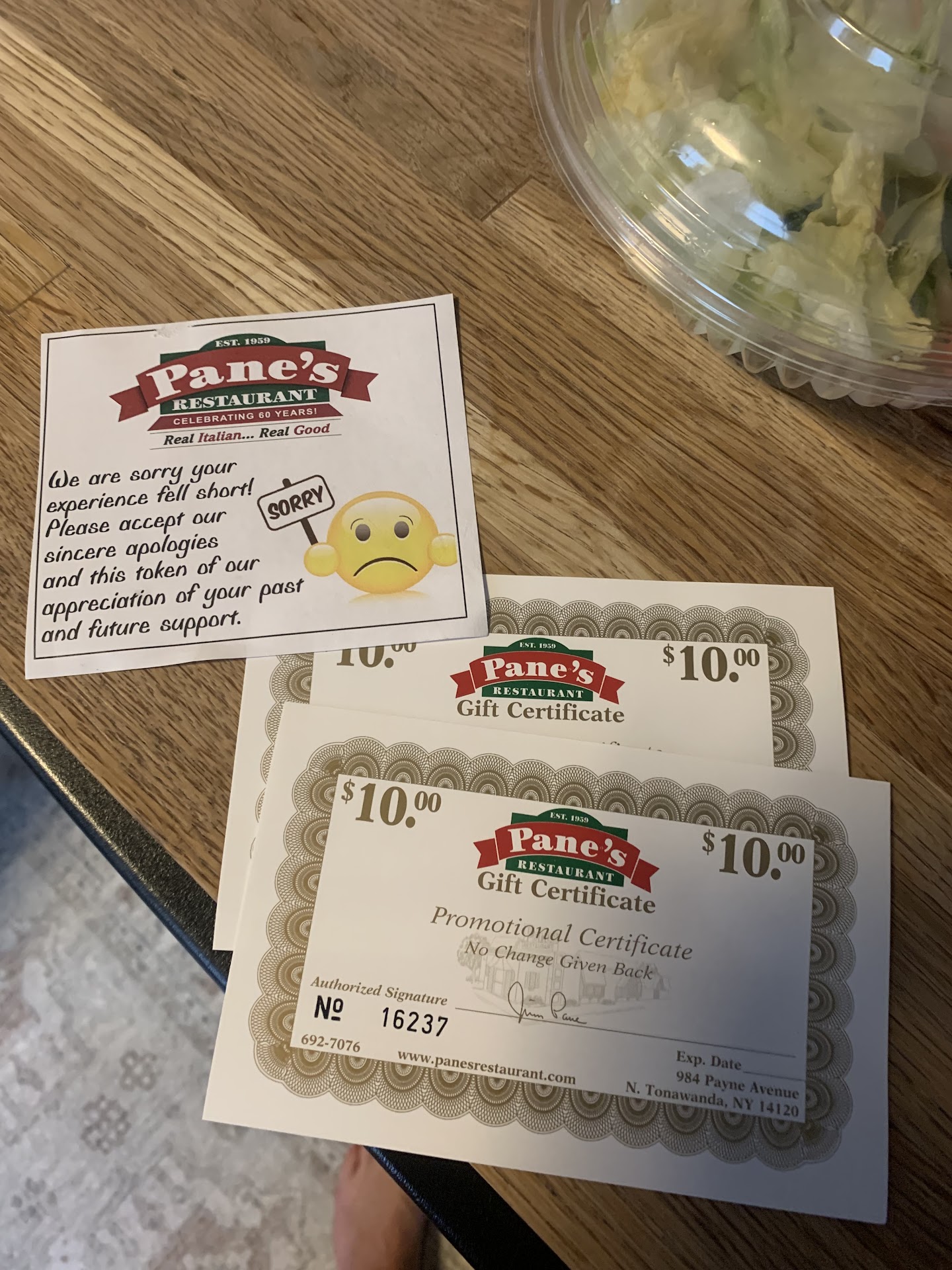 Read moreWe have been going to Panes for years and I have to say the service has dropped to a new low. We ordered tortellini and received only a partial order of 8 small tortellini after waiting almost 40 minutes for it to arrive. Not wanting to complain we just laughed and ate our meals and as we were waiting for our bill the waitress came and brought it along with a whole plate of tortellini and said "your last plate was only a partial plate" lol, I just laughed and said I am full as I had to fill up on bread, thank you anyway. My wife asked her to box it up and we would take it home, so she took it in back and returned with the pasta splattered into what my wife referred to as a box 5 times to large gor the small bowl of pasta, we only realized how it was slopped into the bowl because we had a piece of bread left in the basket I was going to slide in with the pasta, but because of how the sauce was splattered all over the entire extra large box that would not be possible. It truly looked like the box had been shaken before it was brought out to us, or maybe dropped? We promptly paid the bill, not being comped for the meal or even asking for it, but was shocked that they hadn't suggested it or done it themselves. I paid my approx $50 tab for two plates of pasta, two glasses of wine which was gone long before our meals came and we're never asked if we would like something else to drink, not even water. We left the disgusting box and vowed sadly to never return to Panes again. Note, we had breakfast there 3 times in the last year and the service was terrible everytime as well, slow, wrong orders. There is a distinct difference in the quality of the restaurant and service since the matriarch passed away. They also own the grapevine restaurant now and we also loved that restaurant for many years and had already stopped going there because the quality of food has dropped there as well, although we did have good service there. For years I have giving dinner movie gift certificates to couples for grapevine restaurant but have actually been asked by my daughter to not do that anymore because she "doesn't like the food...