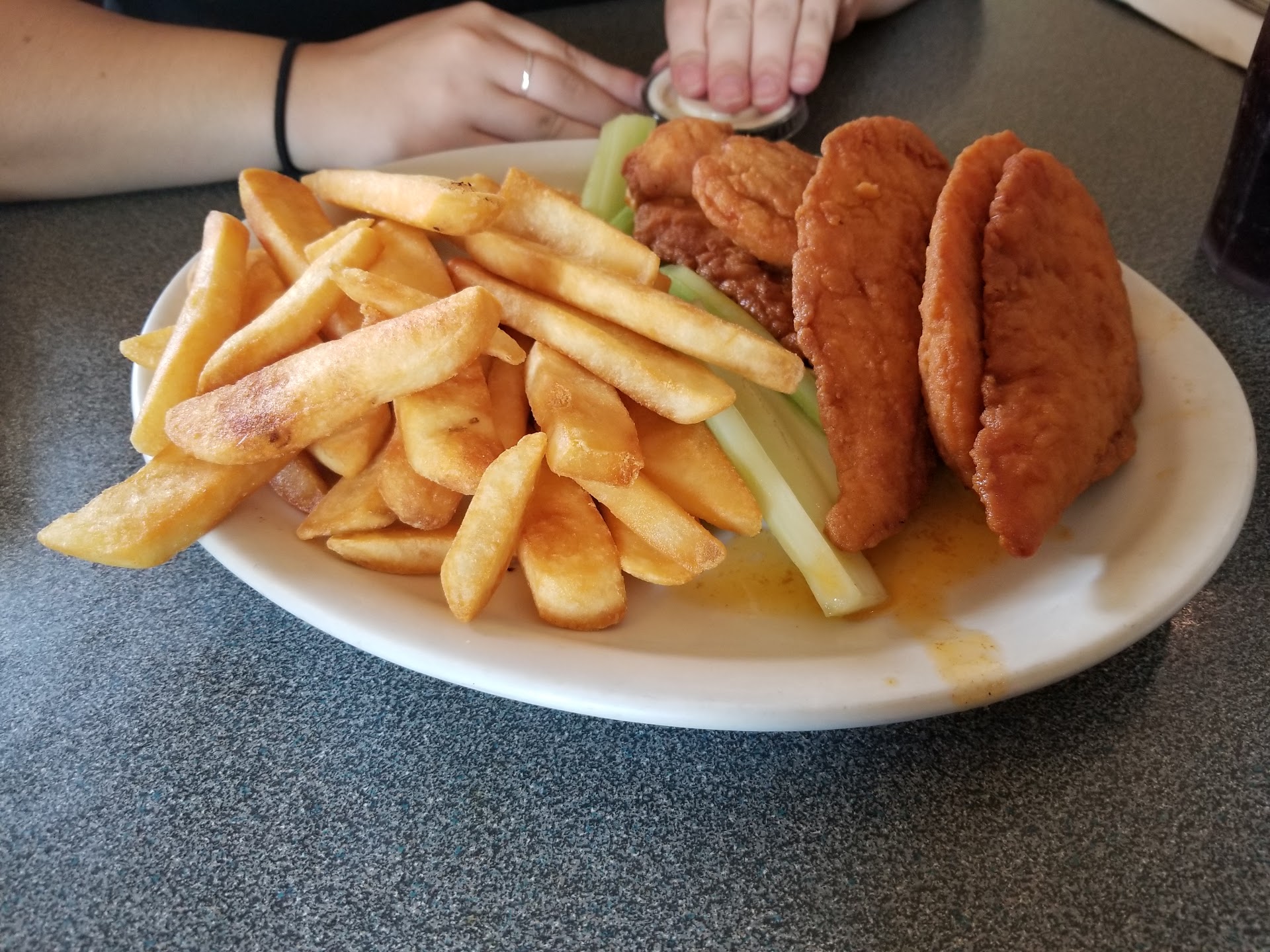 Read moreCame in for a small bite to eat for lunch. Our server gave us a booth (one of four total). Never told us her name. The menu didn't have their options for drinks so we had to ask the waitress, she then rattled off a rather long list of sodas, teas, and such. Any questions about items, she would look at our menu as well, possibly a new hire? We ended up ordering the chicken tender 5 and fries, it took about 15-20 minutes before we got our plate. The chicken tenders were a really good length, however they were on the thin side. The breading on the chicken had a good amount of crunch to it, however it ended up not so crispy. It was really juicy so that was fine. The fries that came with it were unsalted (not an issue, just putting it out there) and the celery was on the thin side. We got fried dough for a desert, powdered sugar and cinnamon to try both. They came out really hot and tasted good.