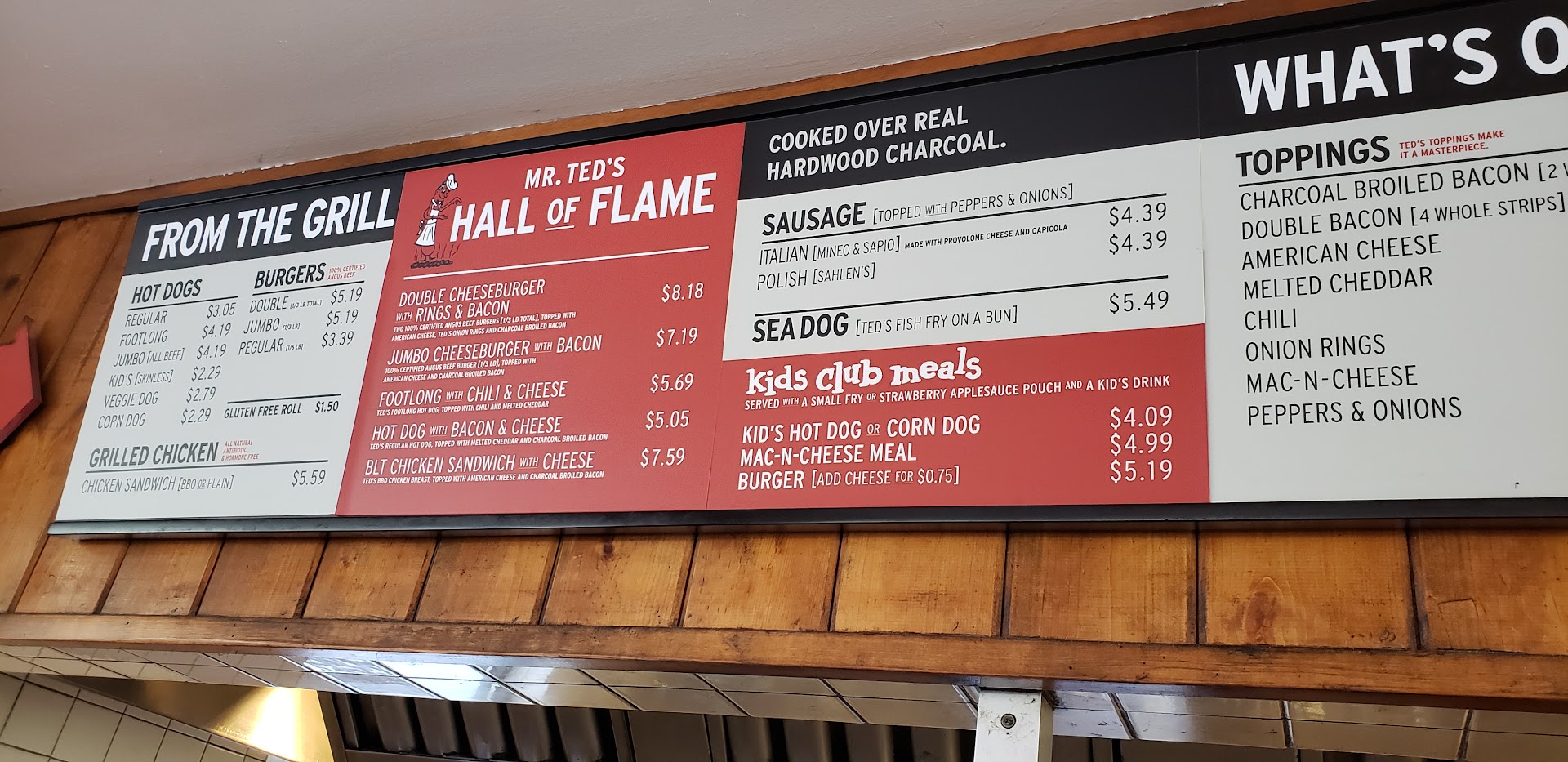 Not the same Ted's that I grew up with. Seems like the overall standards may have dropped from what I remember. If you've never been to Ted's, it is a staple in WNY for their chargrilled hot dogs and hamburgers. Known for the unique flavor of being cooked on a cast iron grill over real charcoal briquettes. You place your order for hot dogs, burgers, French fries, onion rings, and such at the grill. Once your meats are cooked, you tell them what you want to drink and which toppings and fixings you want on the hot dogs and hamburgers. They also have soft drinks and shakes. I went here for dinner, and there were about 6 people in front of me in line. Usually, the line moves fast as they are quick to take orders and get everything cooked and moving along. Not this visit. They were shuffling employees around as employees were asking to go to the bathroom and go on break. The line moved very slowly, and I ended up waiting over 30 minutes in line with only 6 people in line ahead of me. I ordered two hot dogs and a hamburger. They had my burger cooked very quickly, but they then let it sit for a while before it was my turn to tell them what toppings I wanted on it. My burger was cold and dry by the time it was topped and handed to me. Hot dogs had the wrong toppings on them, but the French fries were good. As suspected, the burger was dry and cold. All in all, it was not a good experience and a complete reversal from how I remember Ted's being when I grew up going here regularly. I usually don't visit the North Tonawanda Ted's, so maybe this location has always been mediocre at best. Nothing positively memorable about...