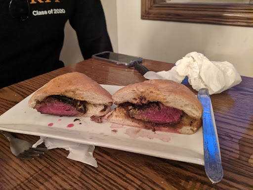 The food was gross. Three of us ordered the steak (mine medium rare, the other two medium), one of us ordered the steak sandwich, and the other two ordered pasta and chicken. All four of us sent our steaks back because they they were so under cooked. When we got them back, we couldn't detect any difference (our running theory is that they were thrown in the microwave). I posted a photo of my steak and Zach's steak sandwich - note that the blood you can see on the plate is from AFTER it was sent back to be more cooked. The pasta was partially cold as well. Based on the other reviews (which definitely deceived us), if you must come here, I would avoid anything more expensive than a burger.