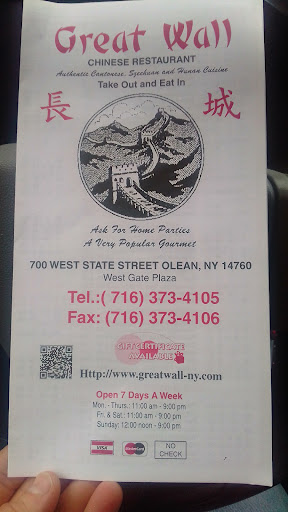 Read moreI eat there annually at least once every couple of weeks. I usually get it to go. I never have to wait very long for them to complete my order... They're very fast. The food has always been fantastic. I try something new off the menu every time I go and have NEVER been disappointed in the choices. It's all so good... I have never had a bad experience the few times I've gone there to eat "in house". Always leave a generous tip. If you love Chinese food and like a little bit of variety, then by all means, go to the great wall. The other local Chinese Restaurants in the Olean area "fail" by comparison to...