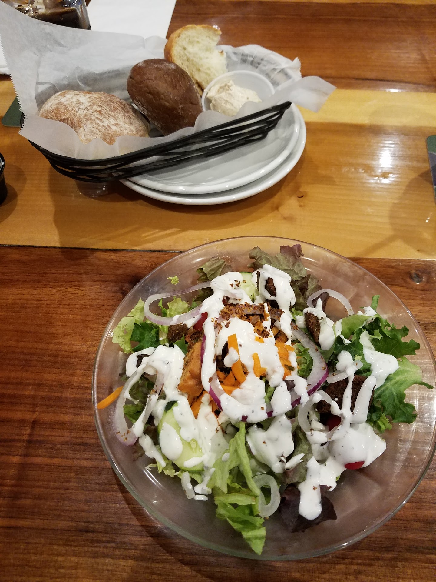 Read moreHave been here several times and all have been relatively good experiences. We usually try to hit off hours as it does get busy during prime time - and generally sit by the fireplace in the bar section. The speedies (chicken) are especially good, as are most of the lunch menu sandwiches and lunch menu reasonably priced. The onion rings are a great and better choice than the fries. The service was good and staff friendly. Dinner can be noisy but understand the management are working on new noise baffles etc. renovations to alleviate that in the next week. The tables are a bit close together it is true and they could be larger. The dinner menu is a tad high on price and the salad quality/selection could def. be improved, at one dinner my vegetable kabob was a bit flavorless but my friend enjoyed her southern style chicken with biscuit. The craft beers are fine but they should have a lager like Stella etc. and Guinness on tap would be nice. Not everyone wants a heavy wheat beer or IPA. There is a full bar so you can get some good cocktail pricing during Happy Hour. Bar staff are good. Ambience is nice, the decor with the needlework tapestry lovely and the bathrooms/dining floors/tables are always clean. The tables by the front window were a little chilly, perhaps more insulation in that wall is needed. The building is relatively new and the atmosphere is rustic. They also retail grass fed organic beef products from the counter, and pastries too. Overall it is a good choice just pick your times carefully. I've got to say even when it has been busy I have never had...