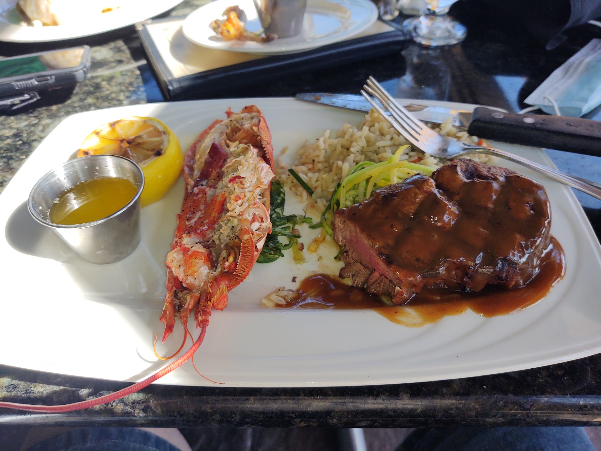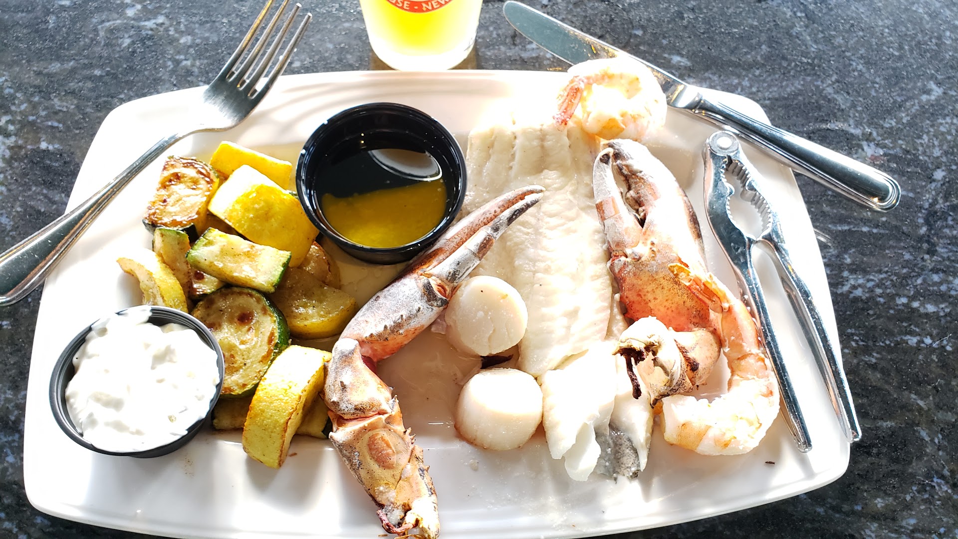 Captains Broiled Platter... Sounded good, looked good, and failed to meat even the most remote expectations. Shrimp, scallops, haddock, and lobster claw were all extremely overcooked. The haddock was so bland it required salt, pepper and tarter sauce to still remain dry and unimpressive. The grilled squash was cooked well, but again, needed seasoning. I think the worst was the lobster claws. When you crack open a shell and a dry rubbery piece of meat has shriveled to half its size that butter doesn't help, you know there is a problem. A picture is worth a...