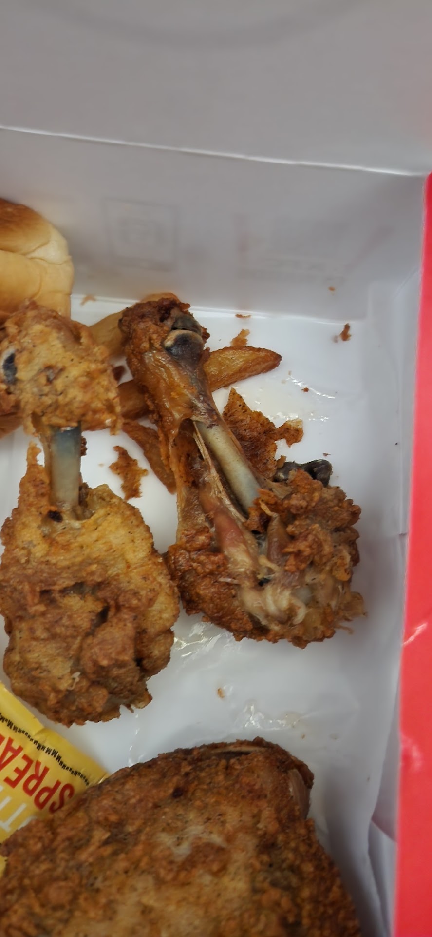 Pot Pie. The (Chicken?) pot pie was terrible. The crust was overcooked and dried out as well as the inside. The chicken was stringy as in chewy type stringy. There was very little gravy and the crust was hard as a rock. "ABSOLUTELY THE WORST POT PIE" I ever had. WHEN I WENT BACK TO RETURN THE FOOD THE MANAGER TOLD ME THAT THIS IS NORMAL, THIS IS THE WAY THE CRUST AND THE INSIDE ARE SUPPOSED BE??? I did get a refund for the pot pie. I won't order it again. Update they mailed me a $25 voucher because I called corporate KFC and told them how bad the food was. *So when I tried to use the "voucher" to purchase a 12 pc dinner that was on the menu they told me I could not use it because the voucher was not valid for online purchases and that 12pc dinner could only be purchased online. The entire KFC experience is totally dysfunctional. Do yourself a favor and don't go...