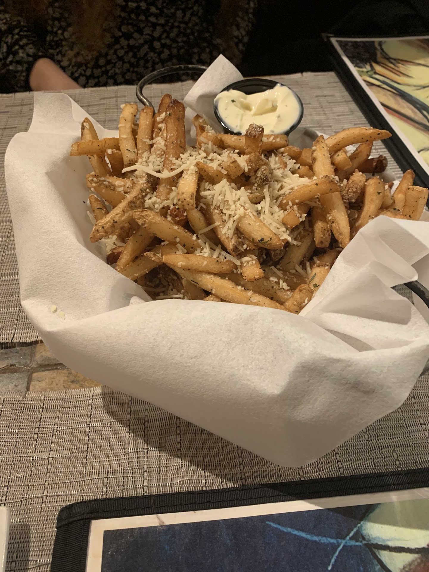 Read moreCame here for a date night with my girlfriend and we loved it. The ambiance was exactly what we were looking for. It was a nice cozy feel and lucky for us we got a booth which helped give us some privacy to be able to chat and have our time together over a nice dinner. I had a dirty vodka martini with my dinner and it was just how I like it, very dirty but well strained so bits of olive from the brine weren’t floating around in my drink. We started with the truffle fries and a cup of the potato cheddar ale soup. We loved both. My GF is a truffle fry fanatic and thought these were the best ones she’s ever had. Soup is a massive staple of her diet and she thought the soup was silky and flavorful, which I agree with. I had the chef’s bistro steak medium and added red wine Demi glacé and sautéed mushrooms. The whole meal was very flavorful and good sized portion. I thought the steak would be a little thicker but am not complaining at all. The steak was cooked medium as I requested and the red wine sauce was so good. I’m a chef who prides himself on cooking steaks so I know a great steak dinner when I have one. The presentation was nice and straight forward. My GF had the fettuccine Alfredo with veg. She liked it a lot. For dessert we shared a Java-tini and the Chocolate covered Cherry martini with a warmed chocolate bourbon brownie soufflé. All were delicious but I liked the Java-tini better. I can appreciate the presentation of the chocolate Cherry one but I’d have rather the chocolate syrup had been put into the drink and mixed up into it than along the interior of the glass. The soufflé was delicious and plated beautifully. Thank you Irises staff for a great night out with my GF. We will definitely be back and will recommend...