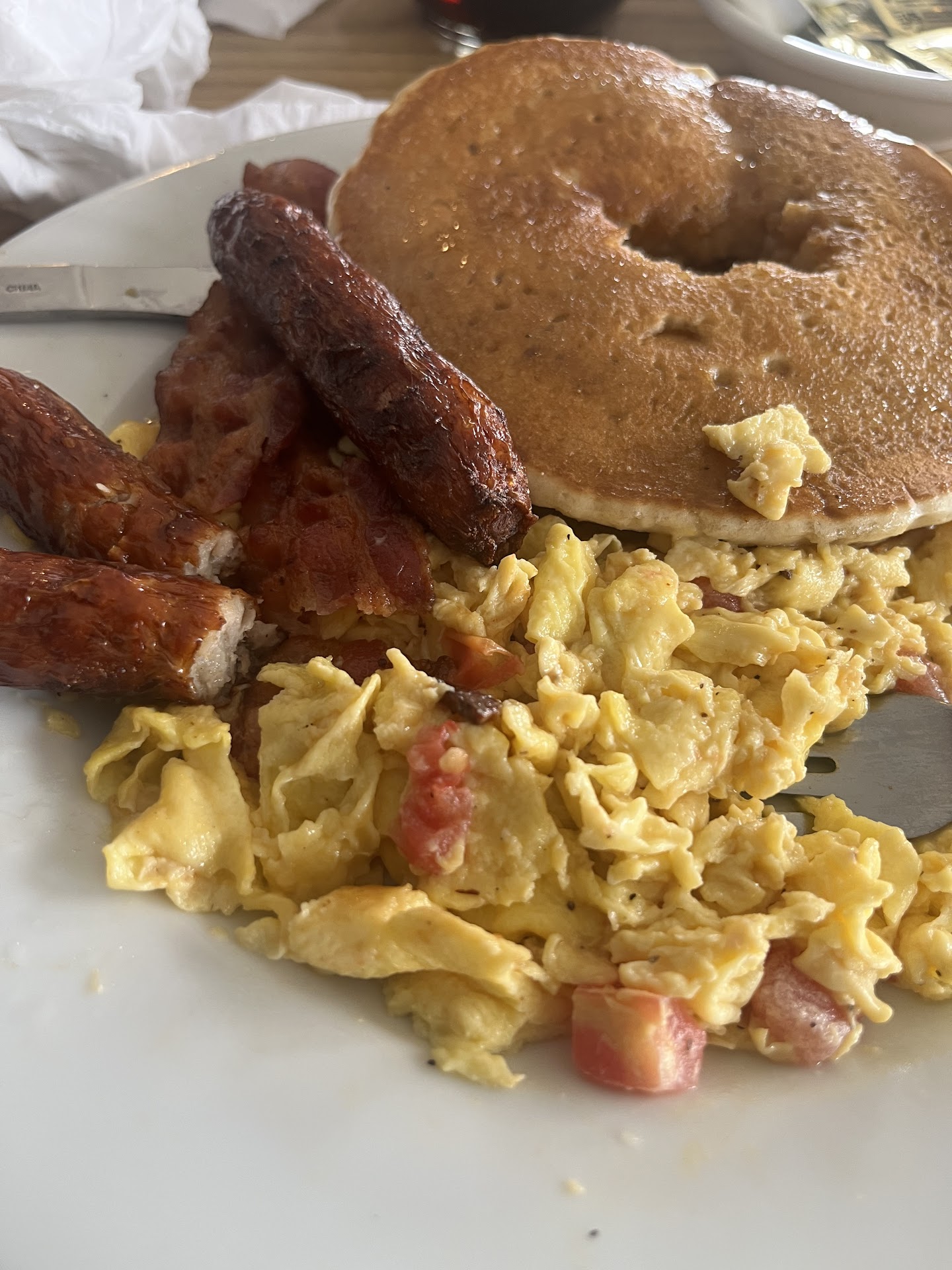 My food….my MEAL…..HOT DAMN!!! Now I know I had a large plate of breakfast. But I needed to prepare for this battle I was going to be in. This mission is important to me for my life and the level I NEED TO ASCEND TO. My pancakes were fully cooked individually filled with FLAVOR, my eggs were SCRAMBLED….SCRAMBLED(with tomatoes). My sausages and bacon all tasted fresh! Everything was fresh…. Quick side note (if only they had other milk options) but overall!!!!!!