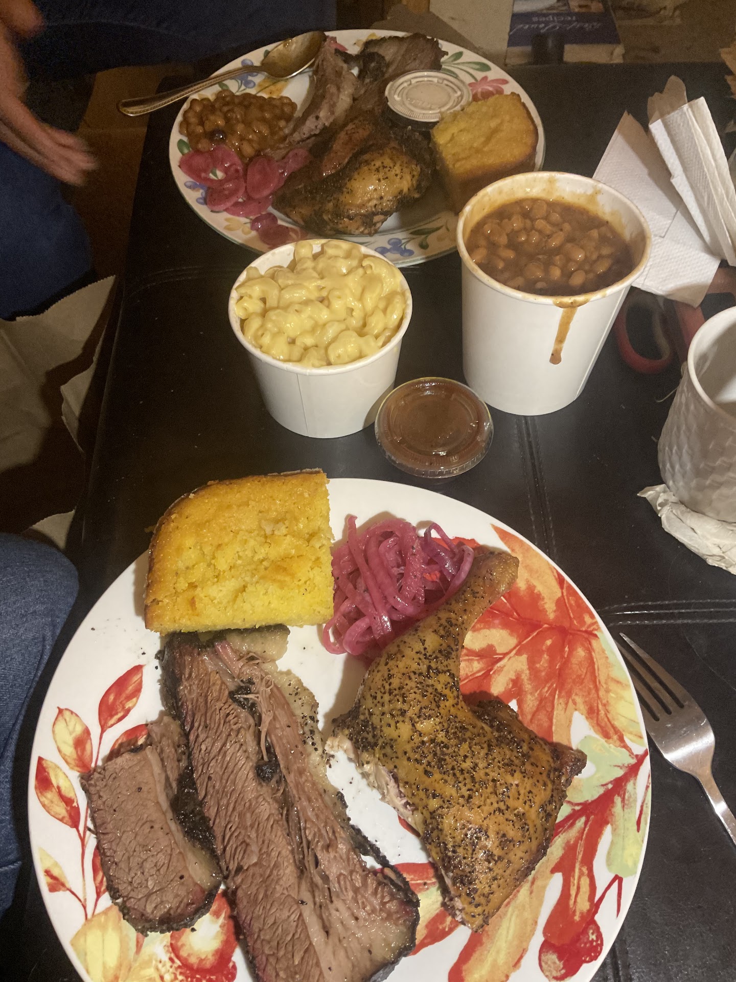 The food was perfect! The brisket was just as I had experienced a couple days before. The chicken was juicy with huge depth of flavor. The skin crispy and delicious. Ribsā¦.banginā! Sidesā¦.banginā! At one point my 7 year old daughter said āthis makes me thankful Iām not a veganā.