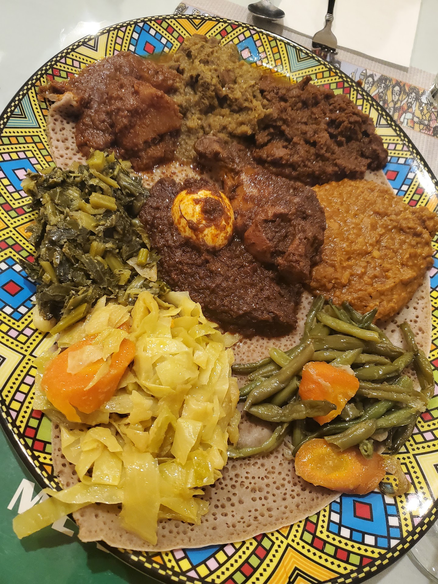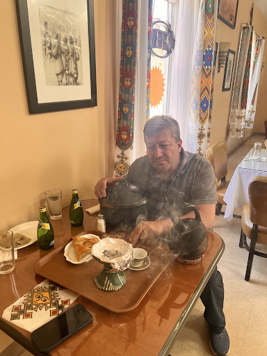 Read moreWe were warmly welcomed by the owner and seated in a lovely room decorated with Ethiopian artwork, and the national flag. We ordered the Addis Ababa platter, which could feed five easily - and costs less than $30. Red lentils, yellow lentils, chard, beef stew, lamb stew and chicken doro wat. Unbelievably delicious!! We were silent, it was that good. The injera bread was soft and delicious, and when our host saw we we getting low, immediately brought more. (There is a tradition to use small pieces of bread to wrap stew, in place of forks. It is especially polite to wrap a choice morsel and feed it to someone - so, you know: Good date spot!) We had the Ethiopian coffee service for $15: It's freshly made best-quality Ethiopian coffee poured into small cups tableside. It's more coffee/espresso than two adults can drink....this is a better choice for a group. There is a buffet offered for lunch and dinner, there is African beer and traditional Ethiopian honey wine, and it's a very family-friendly atmosphere. There's a large parking lot in front of the restaurant, and it's in a safe neighborhood. The Gold Standard for me? Five other Ethiopian expats were eating there. There's a store attached to the restaurant which sells spices, incense, and textiles from the homeland. We will be...