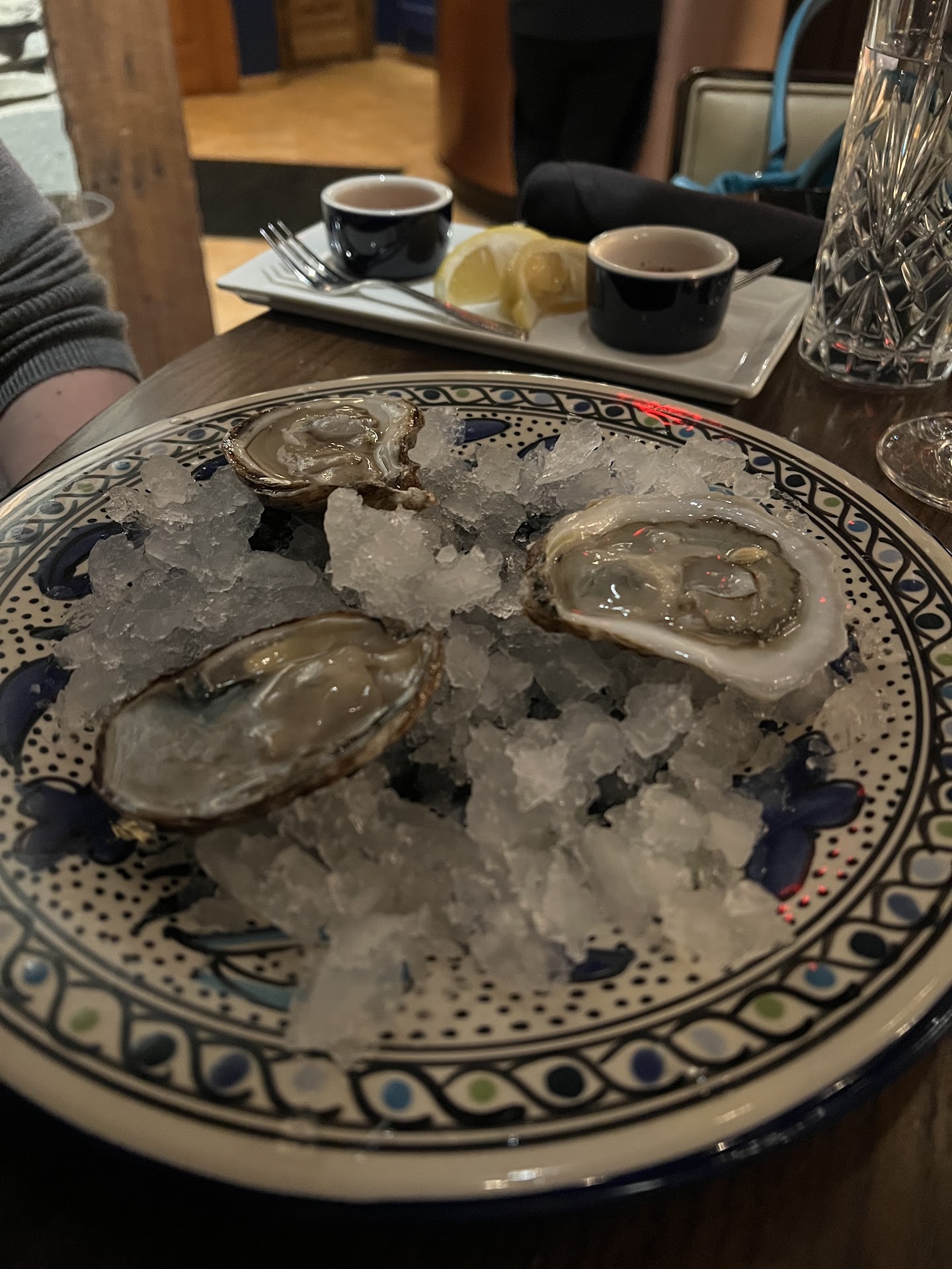 Honestly, it’s a 3.25 but that’s not an option so I went with a 3. I’ll start with the food. The oysters were very tasty - 5/5 on those. The salad was good but not spectacular if a bit overpriced, so I’ll go with a 3.5. The bread was the garlic Tuscan bread, which everyone knows is delightful. I’d read in reviews before going that the bread is super good, so I was confused when we weren’t offered any. I had to ask and then they gave us…2 super thin slices cut in half. It was weird. Garlic Tuscan bread - 5/5 always. The serving of it and needing to ask to even get that? 1/5. The pizza was fine. It tasted exactly the same as the customizable pizzas that you can get at the to-go area of Wegmans. The up-charge in the restaurant wasn’t worth it. We expected something at least a little better than they sell at the pizza counter. 2.5/5. The mushroom pasta with cream sauce was delicious! 5/5. If there was a reason I’d go back, it’s this dish.