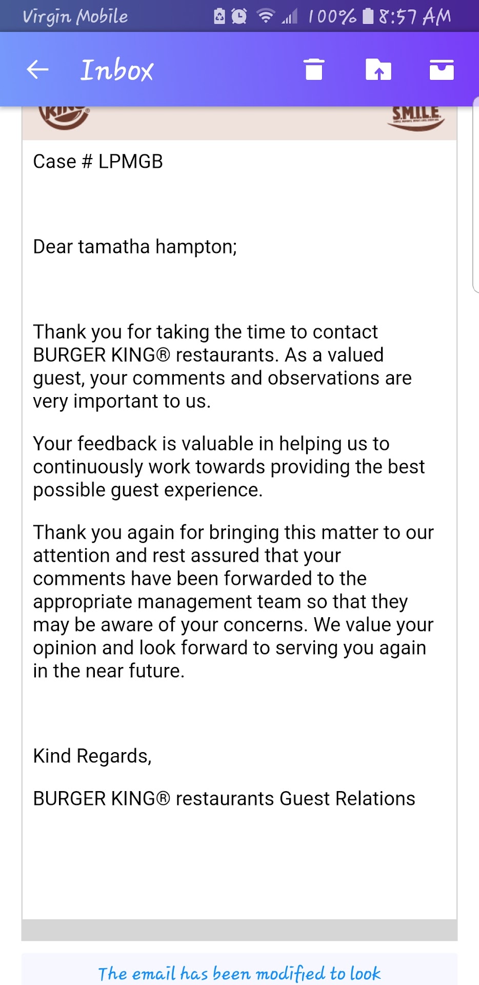 Read moreMy mother and sister went to this Burger King yesterday (12-15-18), and the service they describe was terrible. I understand that it may have been busy but that doesn't give the workers the right to take it out on the customers. The lady at the window refused to add onion rings to the order and then blatantly told my mom that "No, I won't add onion rings to your order, ImI not even supposed to still be here!" Then she abandoned the window and my mom had to wait an extra 10 minutes for someone else to come help her. On top of the terrible service, when my mom returned home with the food, many of the members in my family (4/7), felt sick right after eating the food. I personally couldn't even finish it because I felt that I'd throw it all up. I love burger king and have never felt the sickness that I did when eating their food yesterday. This Burger King is unacceptable and I warn any and all customers not to go to this...