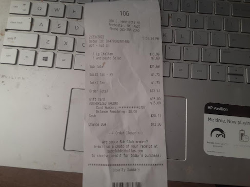 Read moreThis was my first visit here & to be honest, it really went far above my expectations. Used to being ripped off by skimpy subs at other stores, even Wegmans, every location i tried in the past seems tight with their ingredients. I had a $15 gift card i needed to use gotten at my job so on my way home after work i decided to stop by and check it out. Ordered a large Italian sub and Antipasto salad. I was impressed immediately, the salad so fresh seemed like everything just picked out of the garden. The Italian sub was very delicious with sufficient ingredients to even satisfy my critical attitude for subs. The bread was crusty and moist, because the bread is what makes the sub.. Here, at Dibella's on E. Henrietta Road, I must admit, was very pleased. The workers were nice, but so engrossed in doing a good job making subs they forgot to ask me to pay. I could of walked out without paying but of course i would never do that so i had to remind them that i needed to pay. The girl seemed a little embarrassed that she forgot this, but while paying she needed help from another worker on how to let cash machine accept gift cards. After i was done paying, I walked out of the store with my bag of food and right away noticed it had some weight to it, which naturally made me feel happy (meaning that obviously there must have had enough ingredients i am always so concerned about). anyway, when i made it home finally and started eating the sub, I saw what it really looked like, so nice and scrumptious, enjoying eating what i could, then saving the other half to eat for lunch at work the next day. But to sum this review all up, I am definitely going to return again because the food was worth every penny &...