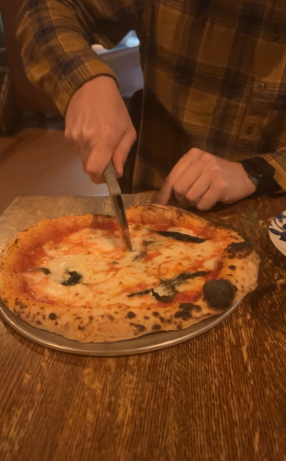 Our chosen entrees were (Special) Pizza $18 mozzarella, burrata, wild mushrooms, speck ham (misspelled as spek), drizzled with baby arugula pesto, thinking I would get something close to what they advertise on the menu “Pizze tradizionali” 12’ Neapolitan pizza, baked for 60 seconds in wood burning oven at 1000 degrees, fragrant outside soft inside, following Associazione Vera Pizza Napoletana rules. Served uncut.” The crust of this pizza was white, with burned spots, reminiscent of badly cooked naan. The rim of the crust deflated upon being cut and was not crispy at all. The pizza had a soggy, mucus-like, paper thin middle (undercooked). A few mystery mushrooms swam in a pool of oily baby arugula pesto. The speck was leathery although abundant. I sent this back after the first gummy, soggy bite.