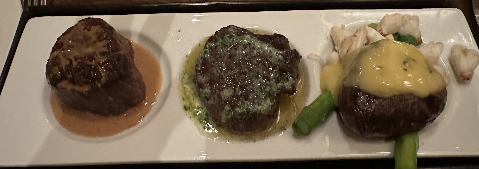 I ordered the grade 7 petite Waygu Strip Steak. My wife ordered the dry aged NY strip. While the dry aged steak is good (and probably better than anywhere else in Rochester), the Waygu was noticeably better (which is expected based on the price and notoriety). The flavor of the Waygu beef is exceptional. I am confident that the Waygu beef and the steak's preparation are the best in upstate NY. The inside was perfectly cooked and the outside was seared/cooked to perfection. The bourdelaise was much better this time around.