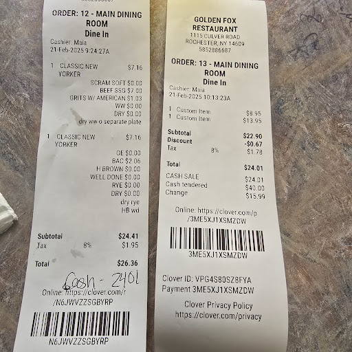 Read moreI use to love to eat here a couple of years ago but I certainly was disappointed this passed Monday 6/5/23. The waitress never took my order or my 89 year old mother. The waitresses were busy filling people’s coffee cups, conversing with others. One waitress was behind the counter eating her lunch and not once looked our way. I felt these waitresses were deliberately ignoring us, for whatever reason I do not know. Racists I believe. Well we will never ever go to The Golden Fox again. It’s a shame how things change for the worst. I’ll just go to Parkside Restaurant which the people are friendly and treat their customers like they would want to be treated. All my friends and family members will switch over to Parkside restaurant also. Your loss not ours. I’m posting a photo of the delicious breakfast my mom and granddaughter had at The...