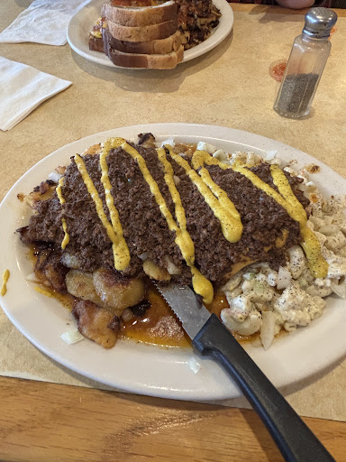 When my brother stops in here she brings the cups and coffee pot. She asks him if he wants his regular and is almost always replied to with a yes. She also knows what I normally get but I change it up on her sometimes. Like today. I decided I hadn’t had a plate in a while so I got one. They also have what’s called a hangover omelette that is basically a plate inside eggs. That’s really good too! The meat sauce here is good.