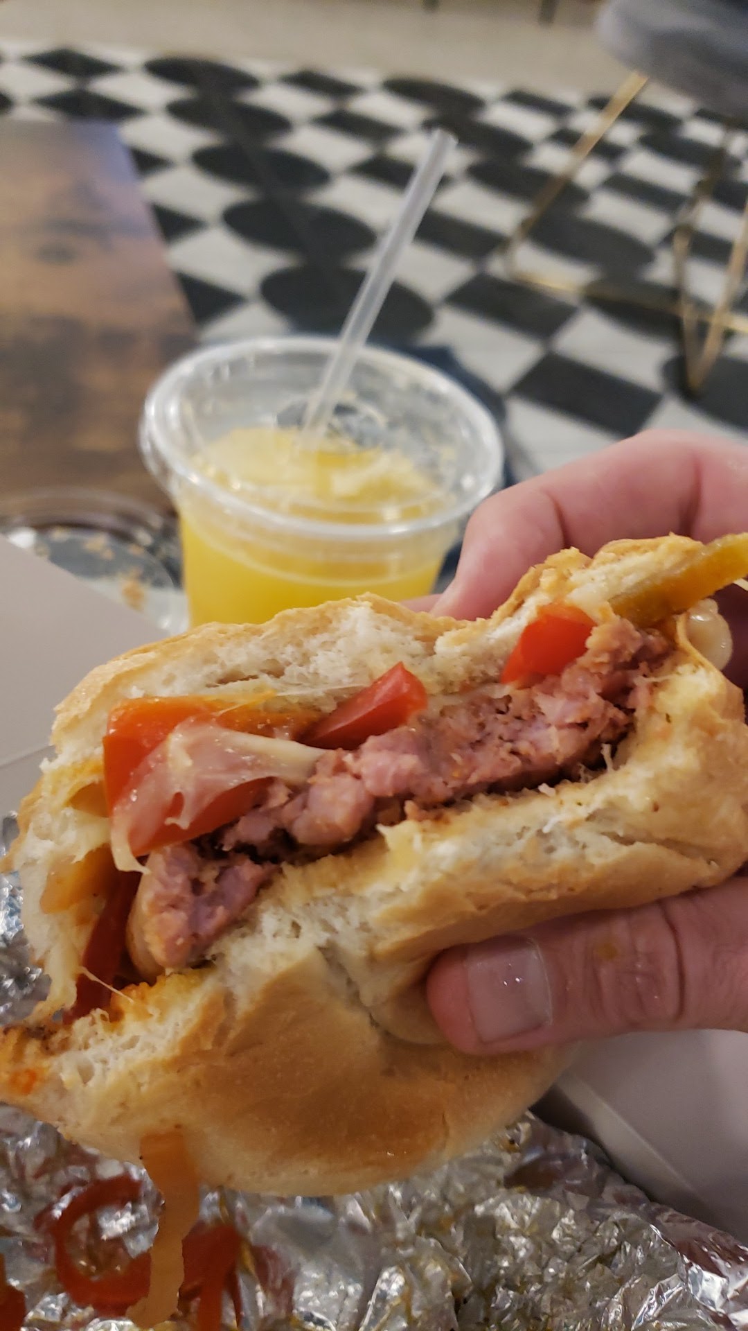 I got the split and seared chorizo sausage link sandwich, and I ain't mad at it. Nicely spiced chorizo w grilled peppers, onions, and a slice of melty cheese does me just right. Sandwiched in a nice amd chewy, soft "hard roll..." (Never can understand why thry call a soft bun a hard roll, but Iguess that will remain on of life's great unsolved mysteries.)