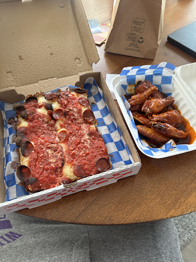 Decided to try pizza wizard for the first time since I usually go to peels on wheels for Detroit (and other) style pizza. I ordered a regular Roni pie and an order of their brown sugar sriracha wings. Overall the food was very tasty! The pizza was solid from a flavor standpoint, but didn’t blow me away. I’m very spoiled by the fresh local and imported ingredients at peels on wheels, so my standards are pretty high. The cheese was cheese, the sauce was tasty, but the Parmesan (which was fine) was not freshly grated (I am being a stickler in this review, the food was solid) my main gripe with the pizza was the crust/undercarriage, which was mildly crispy on the corners, and soft on the sides, as well as a soggy bottom… the flavor of the crispy cheese on the side wasn’t quite as present as I’d liked. At peels on wheels the Detroit crust is always super crispy and the caramelized cheese has a very deep flavor. I’ve never gotten a soggy undercarriage at peels. I thought the brown sugar sriracha wings were delightful. Solid crisp/texture, good flavor, perfect spice level for me. I’d get these again for sure. Nothing crazy from a flavor standpoint but super tasty. The customer service was middle of the road. I walked in and was promptly given my order, hot and fresh out of the oven, but the staff was not particularly friendly. I wasn’t greeted enthusiastically or given a smile, or even told to have a great day and to enjoy my food. Just given my food in a timely fashion. The atmosphere was great! I thought the ambience was really nice, it was super clean and looked very nice. They nailed that. For the price (cheaper than peels on wheels, but bc the ingredients are not to the same level) was very reasonable. I think pizza wizard is the perfect drunk pizza place that’s going to deliver tasty pizza reliably, but if you are looking for the best tasting and highest quality pizza, I’d steer clear of pizza wizard in favor of peels on wheels. Overall I think pizza wizard is a great business and offers a solid product. Peels on wheels is more expensive but that’s because you’re paying for ingredients of the highest quality, consistency, and super friendly and informative staff. I’d give pizza wizard a 3.5 but it only lets me go in increments of 1 so I’m giving them a 3. Would order again and hope they step up their quality and customer service. I am coming at this from a very critical angle and that’s only bc I’m comparing it to the best the city has to offer. Pizza wizard will not disappoint, however I am surprised they have won pizza of the year in Rochester 3 years running when peels is clearly the superior pizza (and they have New York style, grandma style, Sicilian style and focaccia sandwiches!) I’ll be back to pizza...