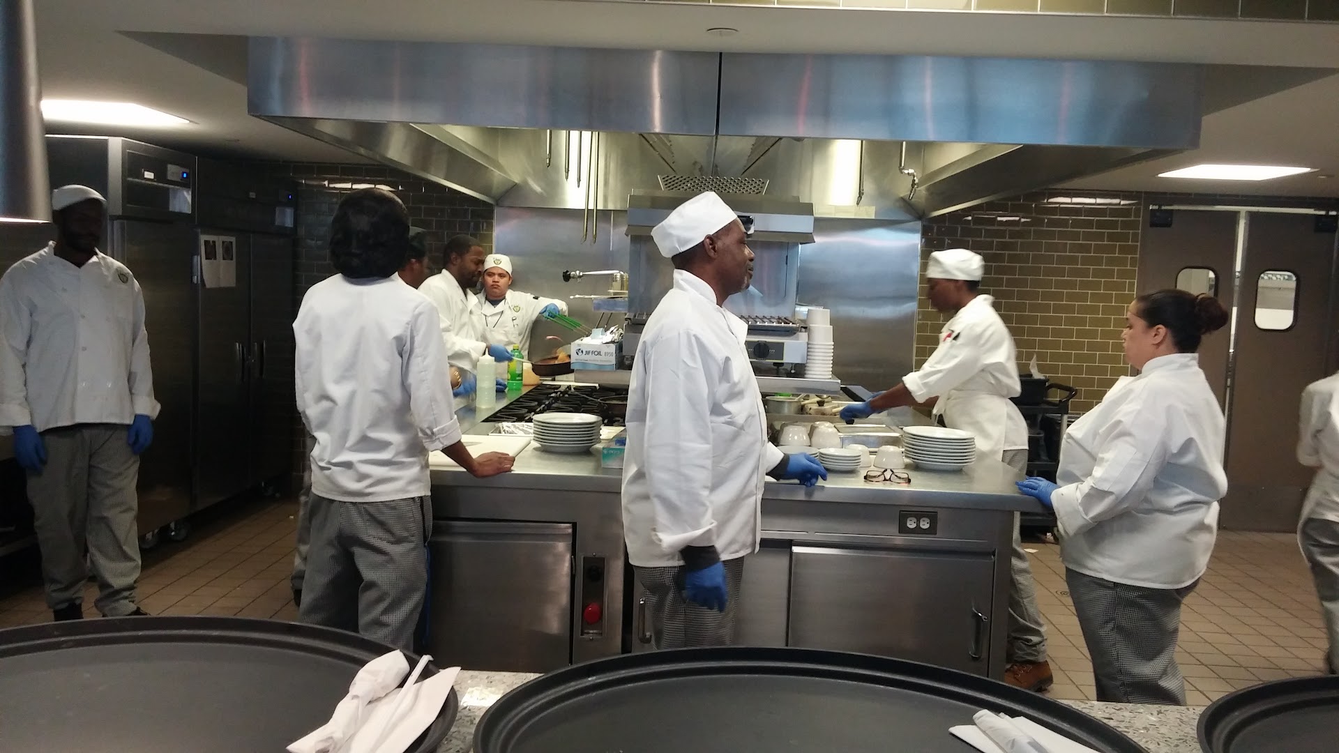 It's a nice space with a host/hostess station situated in front who takes your order right away and then seats you. There is an open kitchen where you can see all the students hard at work preparing the very tasty meals. The kitchen also includes a brick pizza oven, also open, about which one young lady was very enthusiastic. The dim lighting and muted fabrics provided a nice ambience to the entire space. It faces the aforementioned courtyard with soaring plate glass windows that are absolutely wonderful to sit in front of during the spring and summer months.