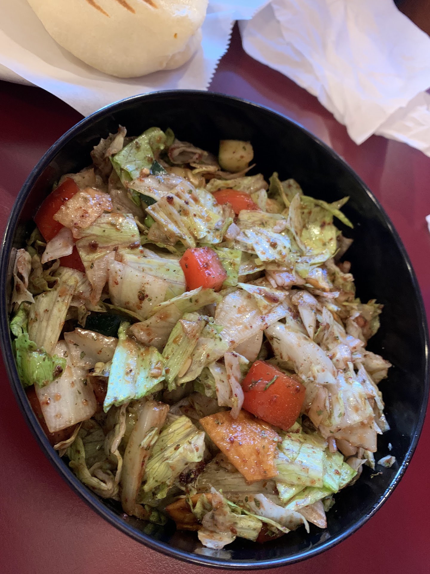 Now on to the food. The fattoush was overly acidic …… I think too much vinegar or pomegranate molasses. And had to on a treasure hunt for the pita crisps. And the lettuce was a bit flat. The chicken kabab in pita was good but could have more spices.