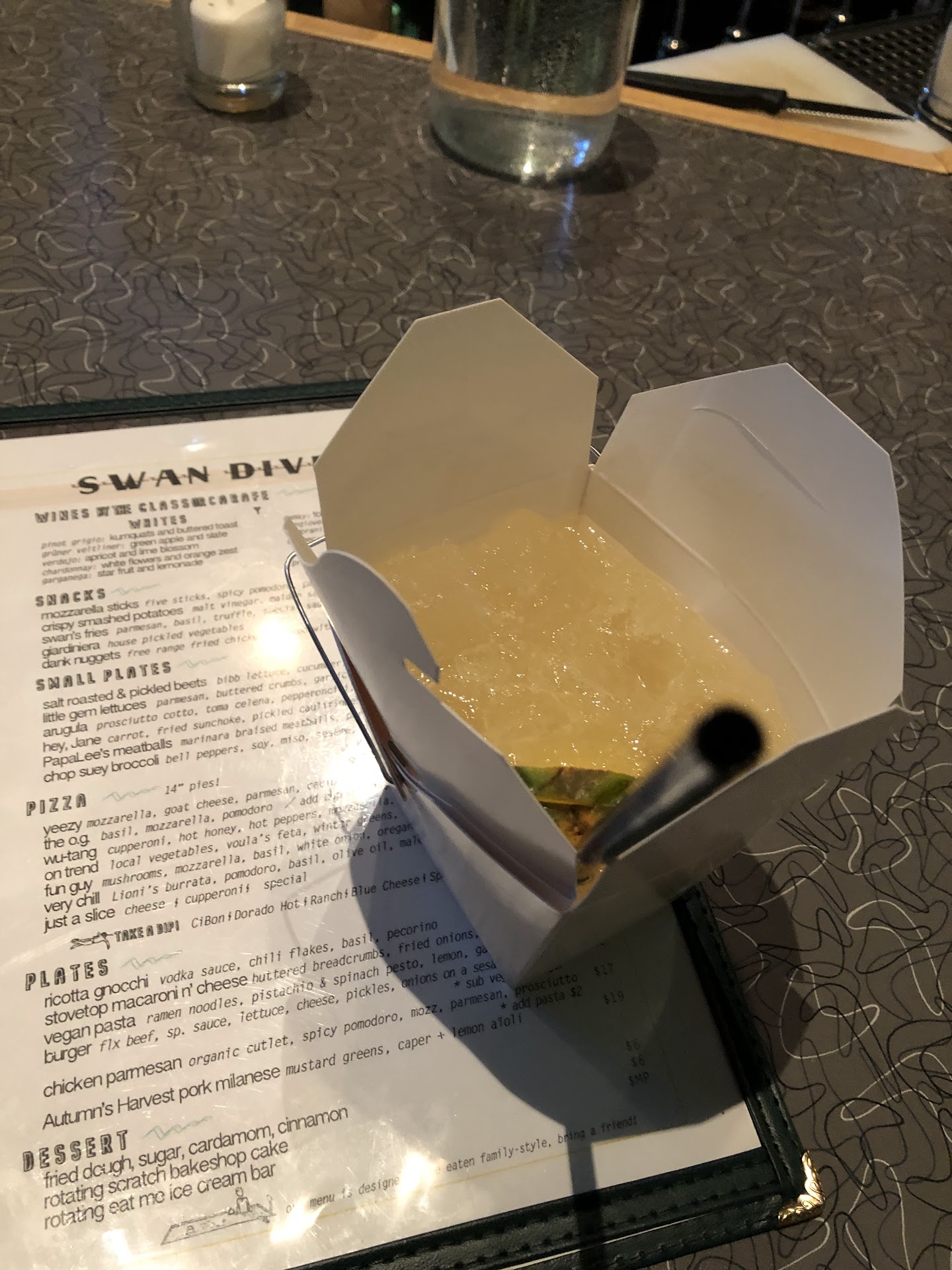 The atmosphere is fun and trendy. Setup is interesting with how you order for first time visitors but next time I’ll be ready for how it’s kind of awkward with the service. My friend and I had the fish fry. The fish was sooo wet inside the nice crispy batter. It was the oddest contrast of textures I have ever tasted. It was almost like the fish had been soaking in a white egg wash and water and then beer battered. Batter, fries, and tartar sauce were very good. The fish you couldn’t even tell it was haddock. It was extremely slippery, not flaky in the way you’d want your fish. The best way to describe it is slimy like and it basically disintegrated in your mouth, very strange! We paid for everything as there was now one to tell that the food just wasn’t pleasant. No biggie we paid and left. I tried to inform them via IG to which they didn’t respond in a humble and “hey we want t make sure people enjoy what they pay for” way. They actually asked if I had ever had haddock....umm who hasn’t!?! So I thought that was a rude way to respond. I didn’t intent to hurt anyone’s feelings but they are a newer place maybe they didn’t taste the food today and something was off with the fish. So someone agreed with me regarding the same meal they had and Swan Dive removed the picture from their IG. That’s concerning as they are censoring the reviews. We didn’t say anything hash and actually give compliments with the constructive feedback. Just a little concerning as I get a lot of my local eatery suggestions from IG and read the comments to see if I want to try out a new place and to thing they aren’t being completely honest with the feedback on their page is interesting. I would give them another try as I have heard the pizza is good but just something to think about. I wouldn’t order the fish ever again. Especially knowing they can’t take...