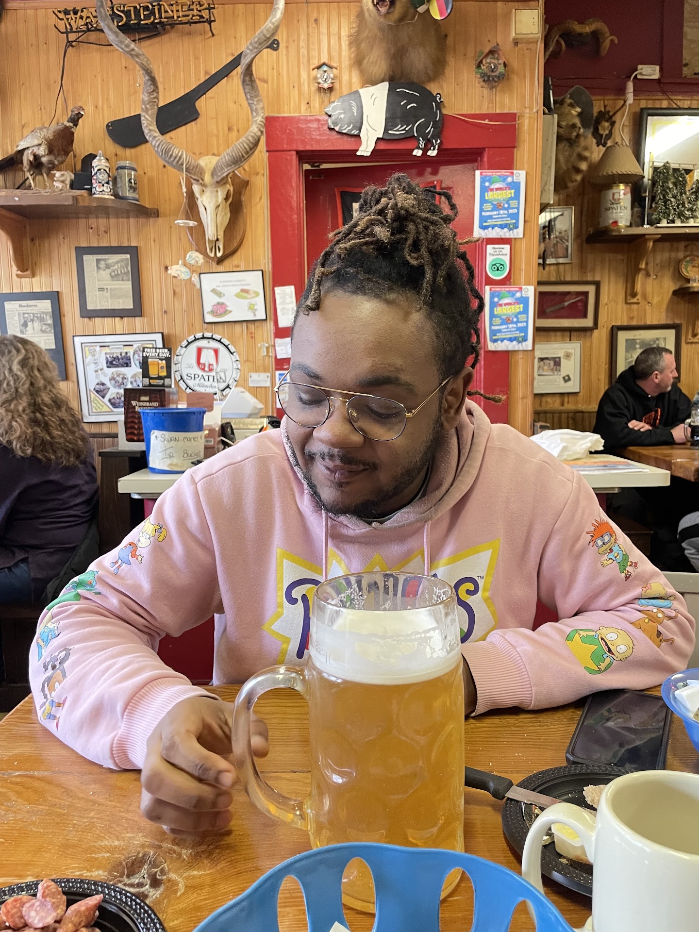They have sauerkraut, schnitzel, spaetzle, various weird sausage and other dishes I forgot the names of, German potato salad. I like to get the German sampler platter which has a couple bites of everything they make, it's a fun time. They do authentic German beer styles and I have never had a bad glass of beer no matter what I get. It is always crowded in here, always kind of loud, and everybody is always in a very good mood. Don't come here expecting to eat a sad Burger and fries in silence far away from a bunch of other people doing the same thing. This is where you come to eat sausage and drink from a giant Stein crammed in next to a bunch of bearded people who randomly break into pirate songs. There's also a market of delicious European treats around the perimeter of the seating area, if you want to grab any of it you're going to be crashing into people but that's part of the charm. There's an awkward dungeon bathroom that's really hard to get to, again also part...