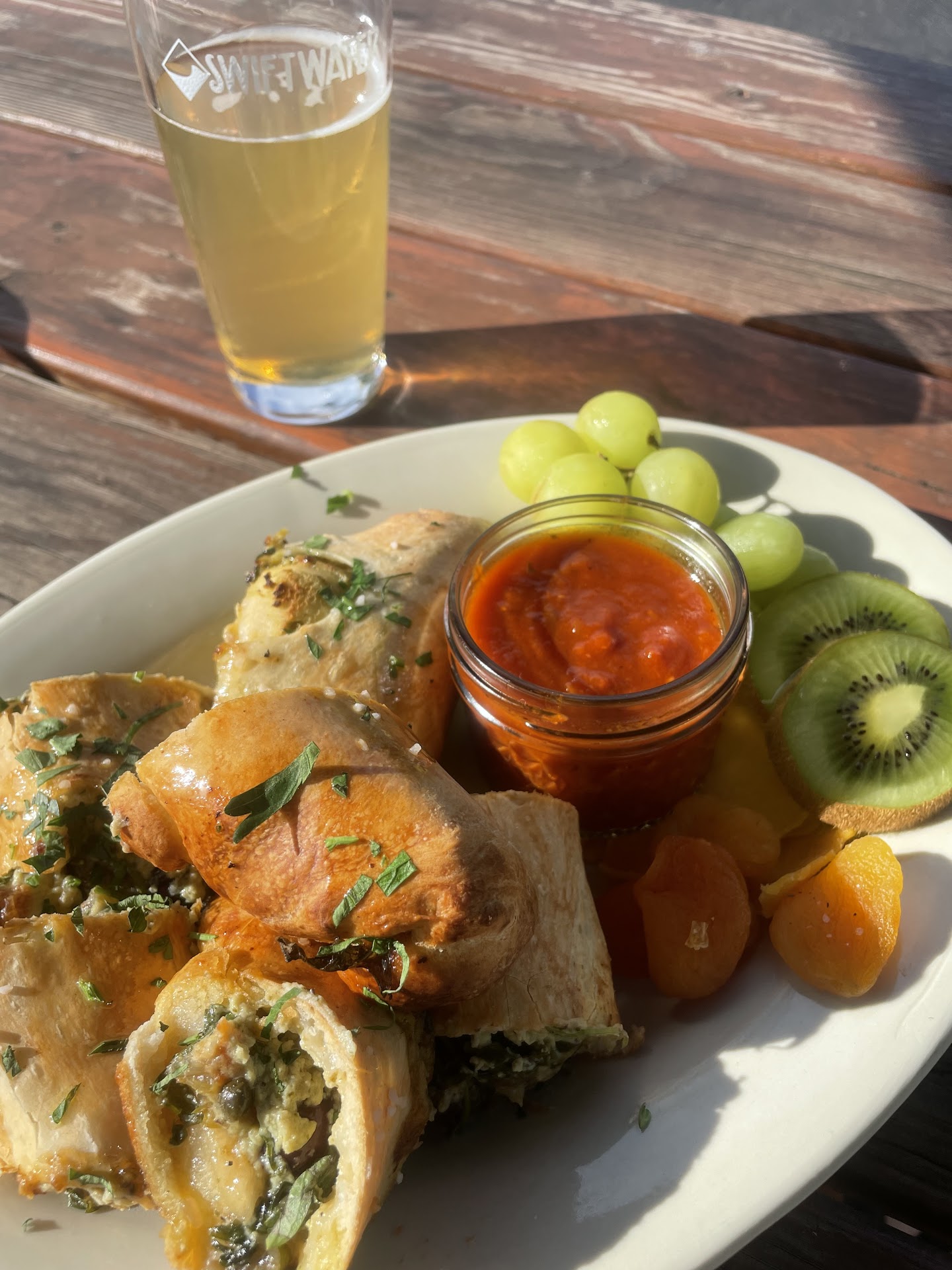 Read moreOK so I wrote a review a little while back about how the vegan food options had become fewer and less impressive. Then, we returned recently and voila! The vegan options are more - and they're amazing! I highly recommend the vegan Stromboli - it comes with olives on the side and is just incredible! How they made tofu taste so believably like ricotta is beyond me...bravo! And especially for a brewery! I love the ciders they host here, so that's what I had with my Stromboli. Not a big fan of the particular styles of beer they tend to have (I like things like Black IPA, Mexican Lager, brown ale, west coast IPA...), but that's ok - we can't have everything. Lots of people love their beer - just not my style. Also...I just love the staff - they're friendly, helpful, knowledgeable, and fun!! Great...