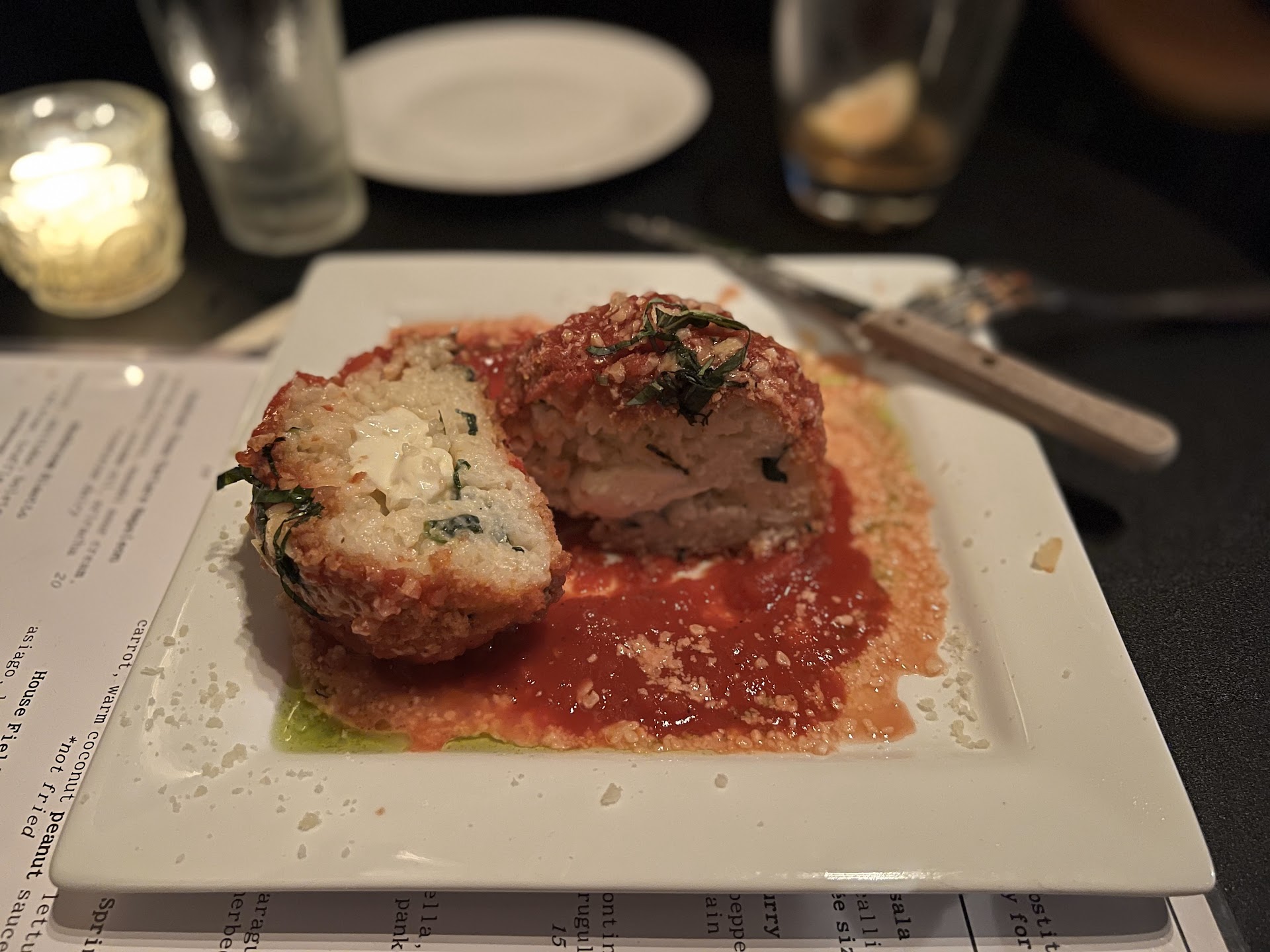 Arancini: Mike said I had to have it... so here goes. It's described as being stuffed with arborio, spinach, mozzarella, then drizzled with marinara, basil, parmesan cheese, and battered with panko crumbs then there's some asiago in these somewhere. That's 3 cheeses and this thing was literally the size of a baseball. Cut it in half and you see all the magic. Also delicious, but crazy filling.
