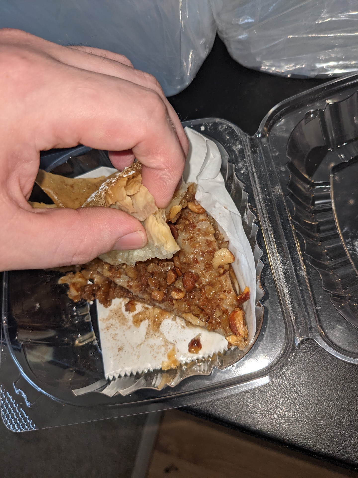 Why 4 stars? The server seemed a little huffy, not unprofessional, just a little less than warm. Also, I went in search of baklava that day. It was good, just not the taste I was looking for. It had a lot of clove, and it just didn't go over with rave reviews at my house. The Kataifi was delicious. I think, had my service experience been warmer, I'd give this place 6 stars!