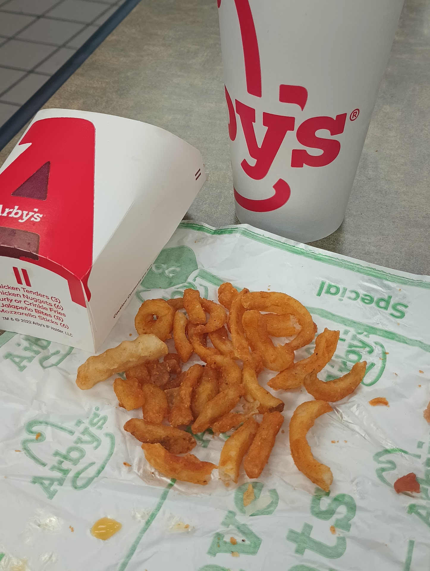 Read moreNormally I like Arby's! This is NOT one of those times! The chicken sandwich was good, but not Hot at all! It tasted like it was sitting around for a couple hours! Yes...I did eat here somewhat late (8:15pm)...but you were still open, so I expected a fresher sandwich! I'd give that sandwich a C+! However, by far the worst part of the meal was the "curly fries!". First, most of my medium box was very small bits and pieces, and even a few crinkle cut "pieces" were found! However, they were practically ice cold!!! No...I'm not exaggerating!! The fries get a grade of F for failure!! The fries were an embarrassment!! I know you can do better Arby's, because I've seen better myself!! Maybe your evening crew doesn't care about quality (or their jobs)...I don't know. But, I expect better next time! As you know, there's plenty of food establishments out there!! Give me a reason to keep coming...