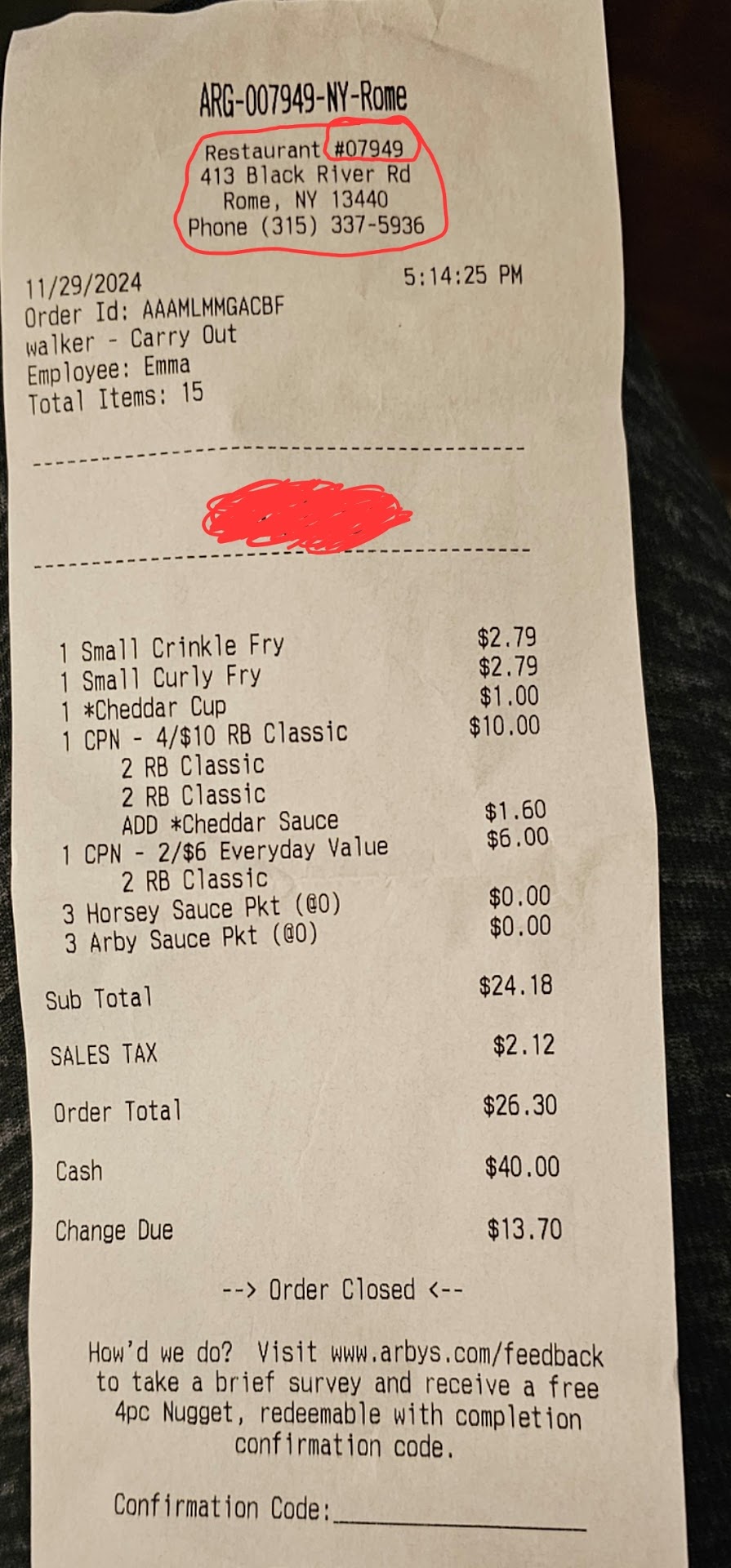 Read moreIf I could give a negative star tonight I definitely would! I have never had a problem with this location before until tonight. I get home to eat my food and my beef n cheddar sandwich had 3 strands (or more for all I know) of gray hair I pulled out of it and it grossed me out so bad at that point I gave it to my dog. I called the location right after to report it and was told "I'm sorry but we can't help you without you bringing the sandwich back with the receipt" so I told them "well that's fine, I fed it to my dog after almost throwing up and just want it reported" then I hung up. I proceeded to do the feedback survey off the receipt, but couldn't do that either because it wouldn't recognize the store location number that's printed on my receipt as #07949 for the black River Blvd location in Rome NY! So, I guess it will be a VERY long while before I bother to give this location my service and waste another $30 or more on...