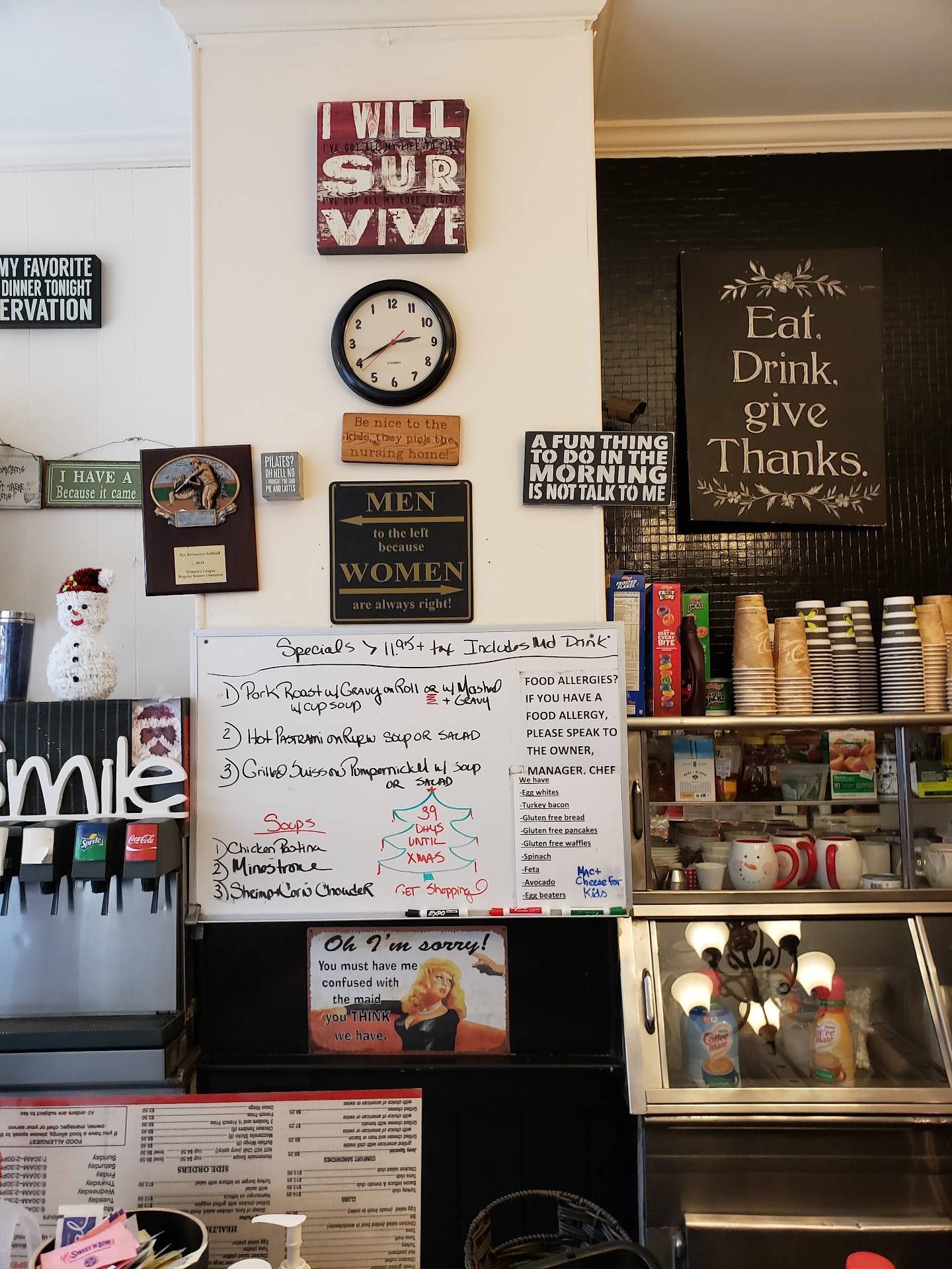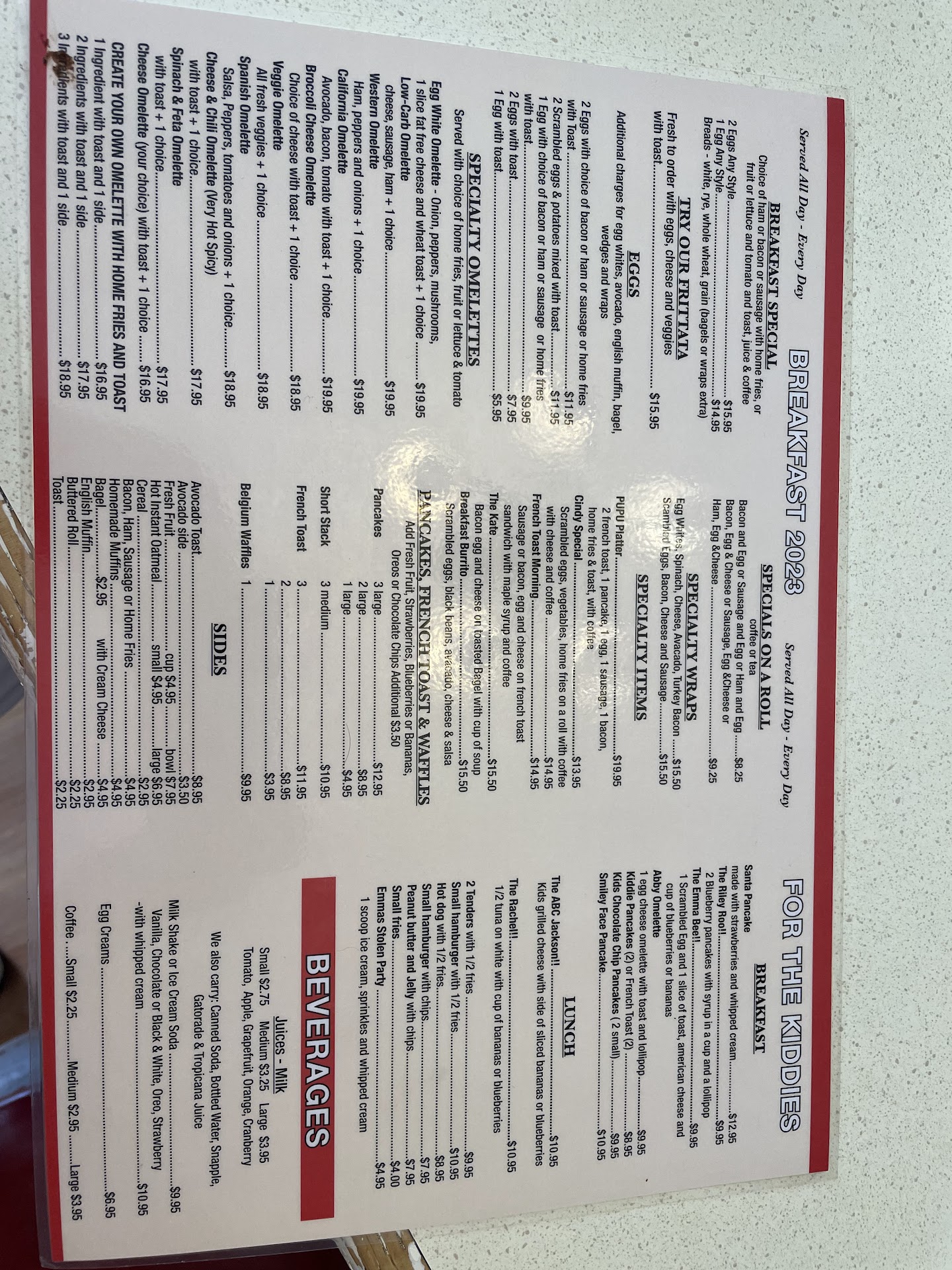 Oh my, lots to say about this place. I sat at the bar and got asked what I wanted to eat literally 5 times after having my menu for 2 minutes. I know they want to rush people out, but give me a chance to look at the menu! Also, the prices are a bit ridiculous.. $20 for an omelet?! Then, I started to look around and was actually disturbed with what I saw. I don’t know how this place is still in business! It’s absolutely disgusting!! Not one of the 5 workers there wore gloves and they touched ALL the food with their bare hands, and I not once saw any of them wash their hands. Then, I noticed they just have a bucket of raw bacon sitting by the grill, not covered or anything. The one woman grabbed a bunch of pieces to put them on the grill, dropped a few pieces on the stove area, and threw it back in the bucket. And again, didn’t wash her hands afterwards. Then, I noticed that they cook EVERYTHING right next to each other on the grill. We got a blueberry muffin, the woman cut it and put it on the grill, right in bacon grease from the bacon she was cooking next to it, then she squished it down with her barehands, and picked it up to put on a plate and give it to us. She then made the eggs, sausage, bacon and chocolate chip pancakes all together. They also used the same spatula to flip the sausage, then flip the eggs, then flip the bacon, then flip the pancakes. If you’re vegetarian, STEAR CLEAR of this place! Pictures attached. Just beyond disgusting and this place must have so...