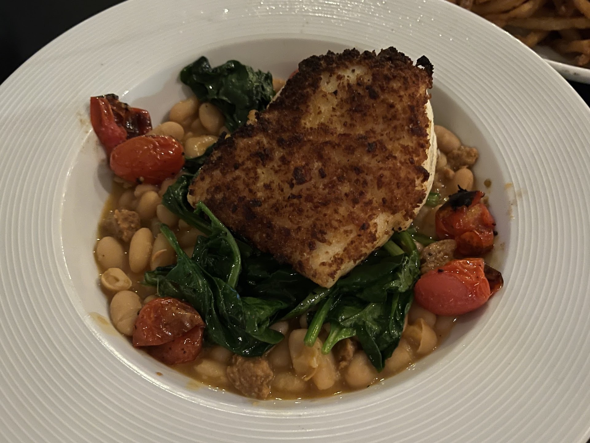 I had the blackened cod. It’s alright. The fish was actually well prepared - very delicate and tasty. The side of white beans with bacon though was overwhelming the fish. And there were way too much beans.