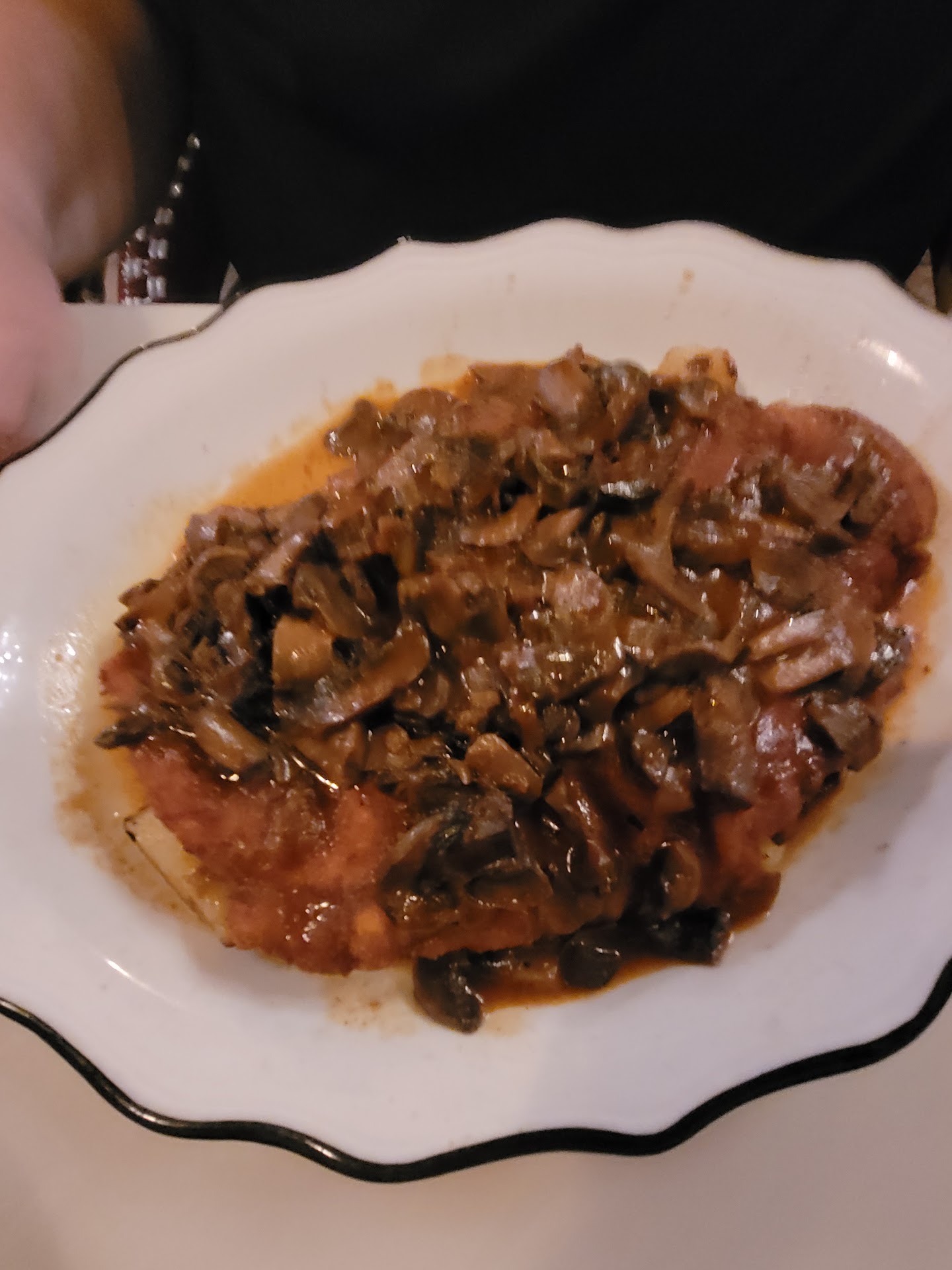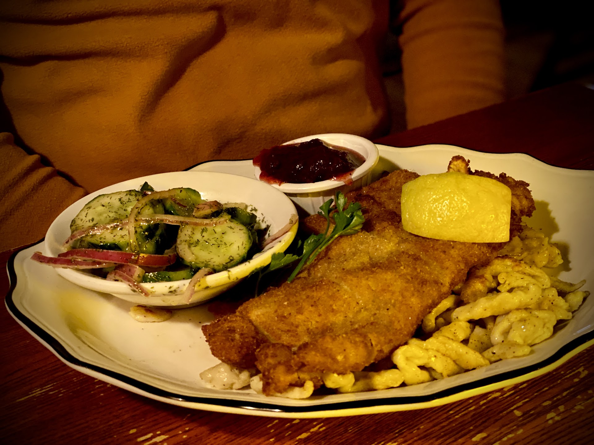 This evening, I again had the yägerschnitzel, the perfectly crispy breaded pork cutlet (yäger means hunter in German, schnitzel means cutlet), in hunter sauce, which is a savory mushroom sauce. The legend has it that when when European hunters went out for wild boar and got one, they’d collect several species of wild mushrooms when became part of the sauce. Chef Vanderstigchel’s schnitzel are crisp, wonderfully tasty, and never greasy. His hunter sauce is rich, complex, and loaded with mushrooms. Heavenly! I like to order this dish with spetzln, those irregularly shaped dough noodles, cooked in broth, just like my Viennese grandma used to make. I’m already swooning just thinking about it. And of course, Chef’s perfectly crispy outside, tender-inside, covered even more than the whole, large, dinner plate, so I get to bring half of it home for tomorrow. Yummy!! But this is not about (the ample) quantity. This is about savoring every single fabulous bite.