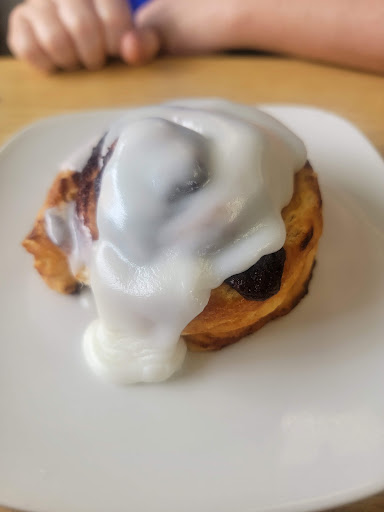 The food was incredible. My husband has already decided we need to make a repeat visit for our next monthly breakfast date. First, I absolutely love that they offer tomato juice; so many places just have V8. I ordered the Irish Omelet with a side of hollandaise sauce and hubby ordered the Breakfast Bowl; both with tater tots. He was starving and ordered a cinnamon roll while waiting for the food. I added a single cinnamon apple pancake as well.