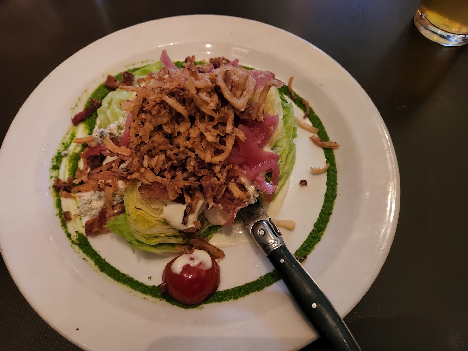 I ordered a Bleu cheese wedge salad to start. The description was intriguing as it included crispy onions (not typically found on al this kind of salad). The onions were delightful, but the salad was served with vinegar (?!?) as well as Bleu cheese dressing. Presentation of the salad was wonderful. Truly, everything about it looked perfect, but there was just way too much vinegar on it. The acidity of the vinegar cut through every other part of the salad.