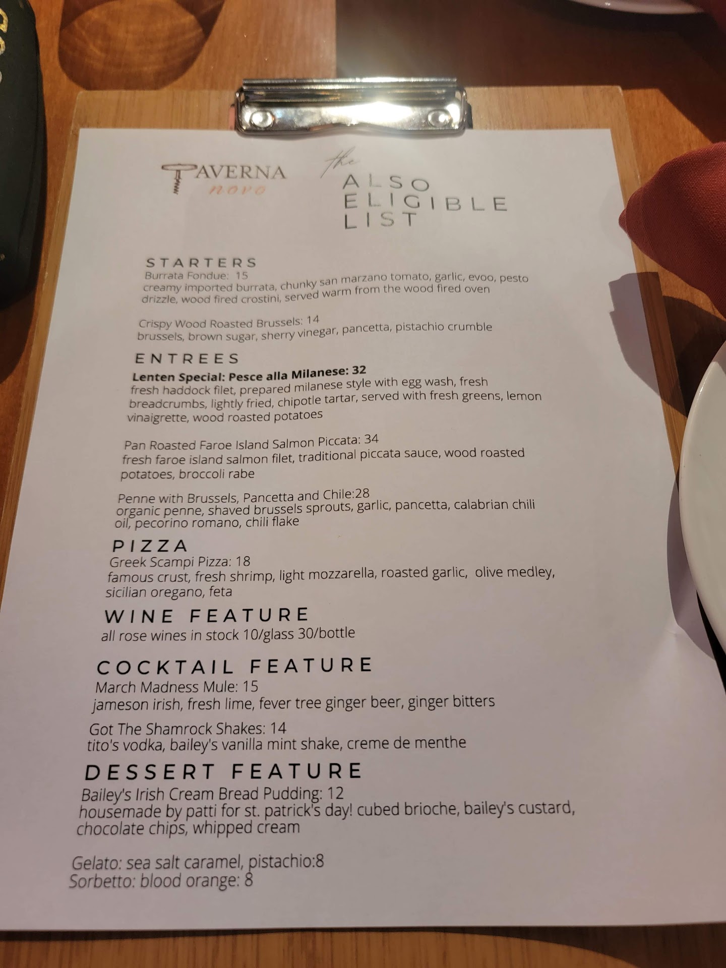 Taverna Novo was a delightful experience and surprise. Who would think in such and unassuming place on a street call Beekman in Saratoga Springs, NY is a wonderful Italian restaurant! When my wife and I walked in Taverna Novo it had a bar and about a dozen tables. But there were more tables outside. Almost like a few Italian restaurants in Brooklyn. Not heavy on decor but the food speaks for itself. I am of Italian heritage so I remember a lot of my grandparents cooking which was GREAT! My wife and I were greeted nicely by the host at the door as well as our wait person Kassandra. She was great. She made us feel comfortable right away and was very convivial. Kassandra handed us the food menu and the wine list. Well when I saw the wine list and wines listed by the glass, I was like a kid in a candy store. Throughout our dinner my wife and I tried a couple of different wines. We had a great Verdicchio and to my surprise a great Vermentino from Maremma which is one of my favorite regions in Tuscany for wine. The best part it’s sometimes very hard to find whites from Maremma. But to top off my night I had a Baby Super Tuscan that was delicious and velvety. Ok now my wife and I ordered the warm Burratta and olives as our antipasti. Delicious the crushed Marzano tomatoes were sweet and savory and the sauce seasoned perfectly that spelled Italy. Assorted warm olives were a wonderful accompaniment. Then our main course we went with pasta. I had the Cacio Pepe with Bucatini. The flavor and creamy flavor brought me back to Rome. My wife had the Penne Fresco with roasted tomatoes , artichokes and fennel. Delicioso! Dessert Pistachio Cheescake, espresso and my wife hand Frangelica and I had Lemoncello. What can I say? We can’t wait to get back again in near future. Ciro Matrecano. Former Food & Beverage Director of New...