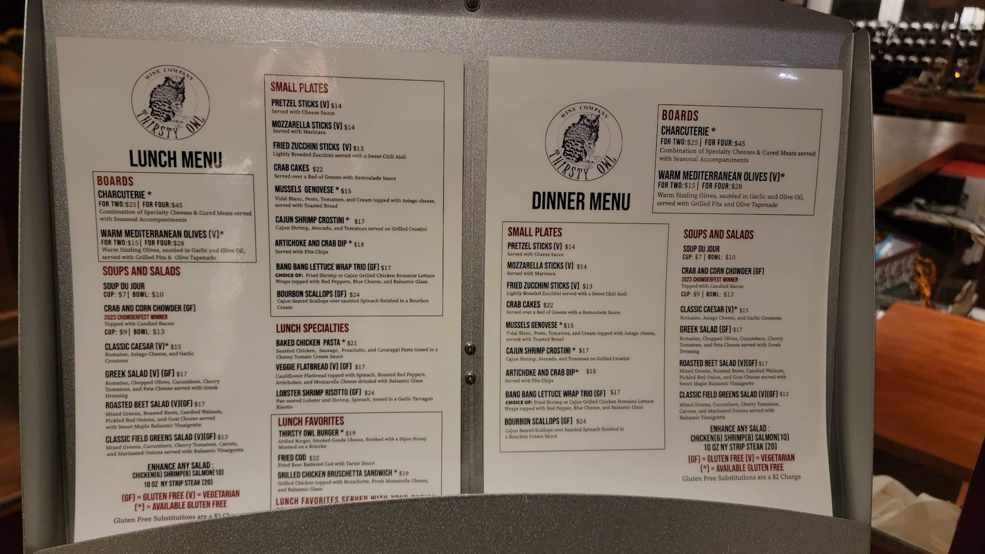 I wish I could give more than five stars!!!! Two tips for an amazing time: request Elizabeth and order the Myers Lemon Cake dessert!! Of course, you must order wine as well! My husband and I visited for an impromptu lunch while staying on a short overnight in Saratoga Springs: as we drove by the sign, we were overjoyed to see Thirsty Owl here and actually turned the car around! We are frequent patrons of the Thirsty Owl Winery and Bistro on Cayuga Lake, but we did not even know that they had one here in Saratoga. We stopped for a quick lunch and then end up having such a great experience that it was the highlight of our trip! The service was fantastic! Absolutely top-notch! Elizabeth was the kind of server that gets to know her patrons, and takes the time to make each person feel at home! She was knowledgeable, and willing to stop and talk to us about the local area, and also gave great recommendations on the menu and on the wines! It was on her recommendation that I tried the Meyers lemon cake, and I couldn't have been happier! Our whole meal was spectacular from start to finish, with delicious food that was the perfect size for our lunch needs. I had a chicken panini that had the most divine roasted apples in it, and my husband tried the pulled pork tacos, which had pork so tasty it could be eaten by itself. The wine was spectacular as always, I ordered a glass of the Diamond and he had a class of the 2016 Chancellor. We always highly recommend those, and were not disappointed! After each course, Elizabeth expertly cleared our area, and packed up our leftovers for us, a touch that was elegant and so unexpected. She even found us two commemorative wine glasses, which was perfect as we collect glassware and wanted something to remember our excellent experience with. By the time we had finished our meal, she had two perfectly packaged bags for us with all of our goodies! In summation, this was a delectable meal that was eclipsed by even better service! We were so impressed that the chef even came by our table to personally check in on us! Thirsty Owl never disappoints, and I highly recommend it, whether you are a wine connoisseur, or just two people looking for a...