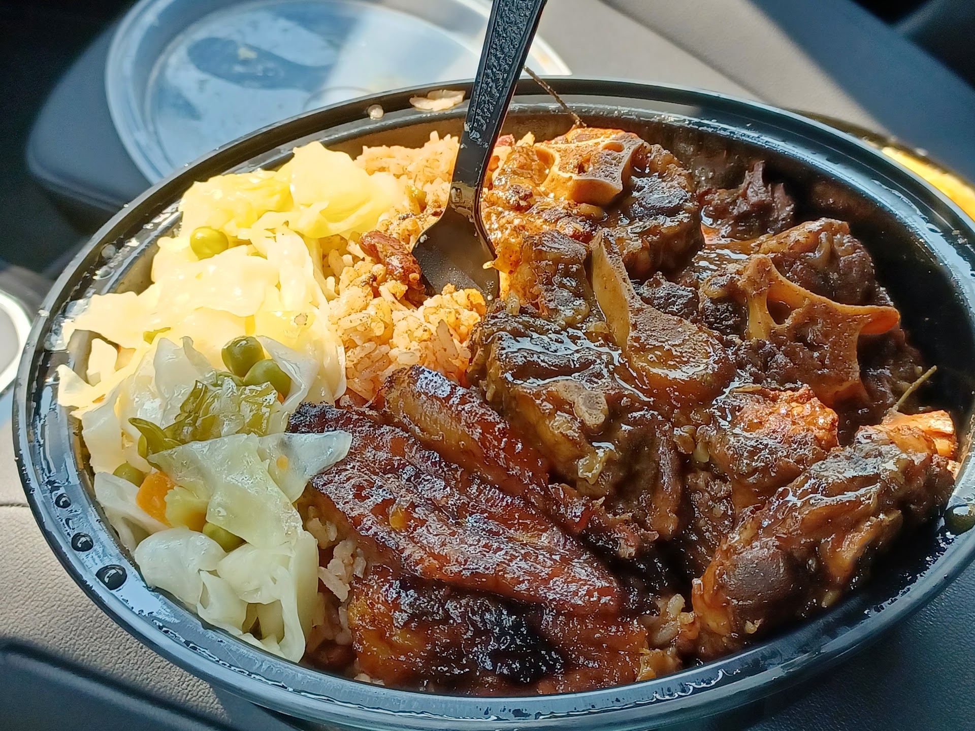 Yesterday was the day. I ordered the braised oxtails cooked with Lima beans and comes with steamed cabbage, rice and peas and one fried plantain.
