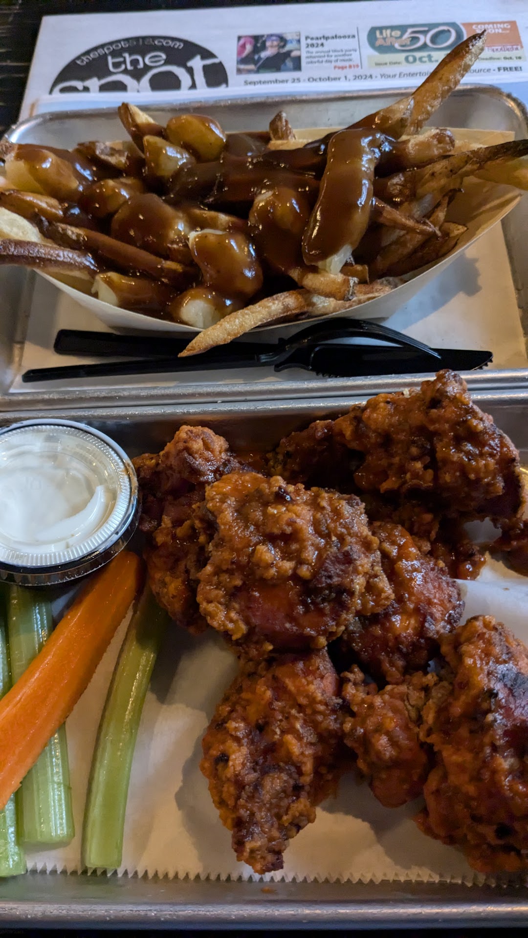 We ordered drinks (which my partner enjoyed), then asked for a pizza and fish & chips. We were told the pizza would take about 30 minutes, which was fineâwe specifically asked for the fish & chips to come out with the pizza so we could eat together. The bartender said sheâd let the kitchen know and offered an appetizer in the meantime. We ordered wings, expecting them to tide us over while we waited.