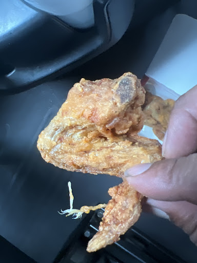 The chicken drumstick I bit into was likewise polluted with honey/sickly sweet something and the one bite I swallowed was both VERY greasy AND VERY dry and had a bizarre taste and nasty, lingering aftertaste. Not sure how they managed that, but the chicken is revolting. My husband also tossed his biscuit but decided that he would eat one of the thighs. He bit into it and some orange slime came out. WTAF?