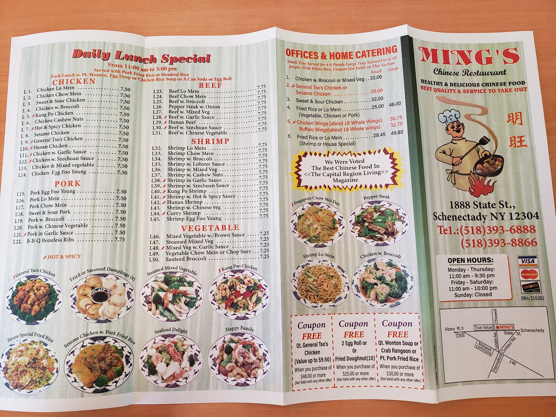Read moreMings on state st. We were customers for years. We travel across the city to get the food from there. The food WAS phenominal, flavor was always spot on, fresh and awesome. Tonight we ordered #1. Hot & spicy shrimp- pan fried shrimp was hard as a brick and Not spicy, white rice was over cooked and gummy and no flavor; #2. Shrimp mei fun- NO Flavor at all. The only sauce/ liquid on the noodles was the water the noodles were cooked in; #3. Wonton egg drop soup- no flavor, added soy sauce, salt and it still had no flavor.the wontons, we have no idea what meat was in there. It wasnt any wonton we ever tasted before. Bottom line is we wasted $28.00, are still starved and the only thing that is feeling full from food is our trash can!! Needless to say the new owners are not meeting up to the former owners standards...
