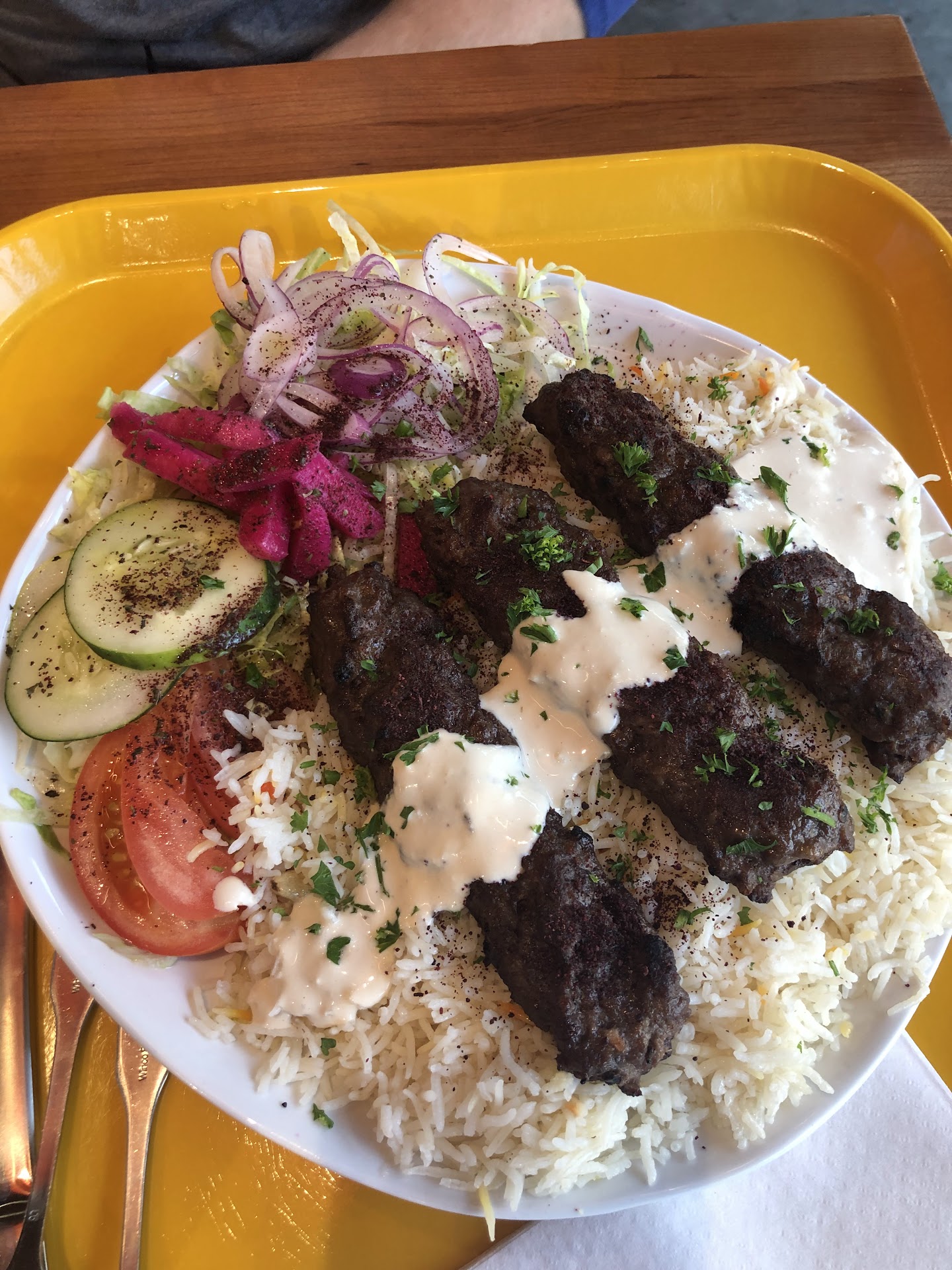 We arrived late on a Saturday afternoon in time for an early dinner and were sad to hear that all the varieties were already sold out. Definitely a bit disappointing but understandable since they looked and smelled amazing. We ordered the beef kebabs which came with a plate of rice and some pickled veggies and a yogurt sauce. The food was cooked quickly and was very fresh. The meat was tender and utilized a wonderful assortment of spices. The veggies and yogurt sauce were nice complements and played off the seasoning. This was a very generous potion and fed 2 hungry people. The prices were very reasonable. I would absolutely recommend...